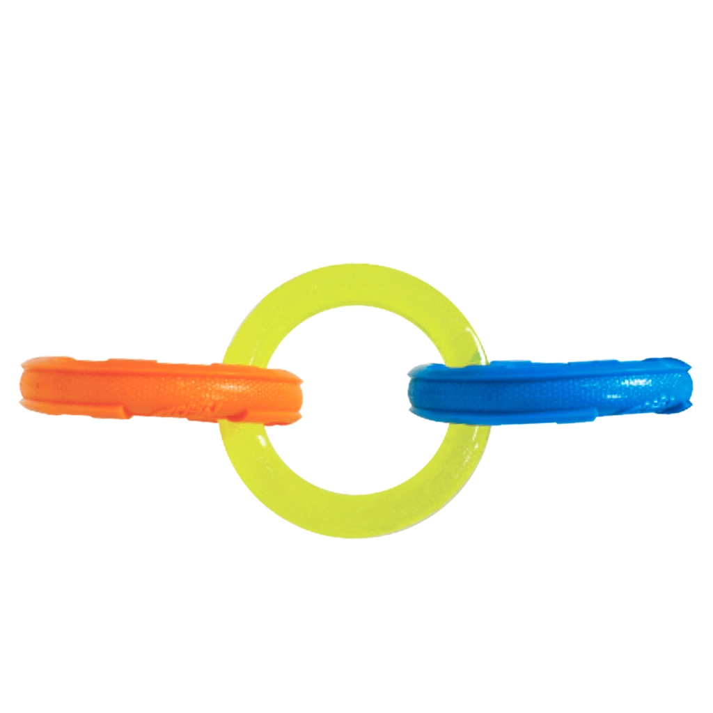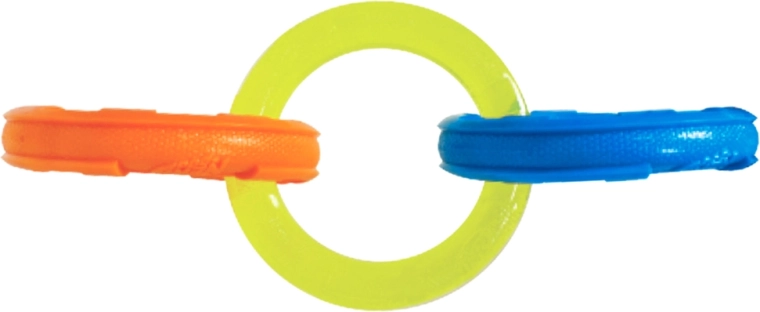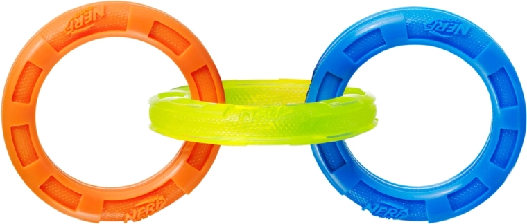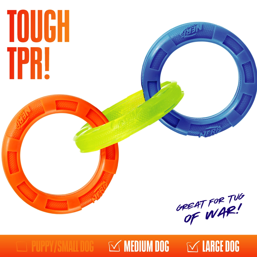 Tartós, interaktív kutyajáték három összekapcsolt karikával húzáshoz és apportírozáshoz. A 26,7 cm-es hossz ideális közepes és nagy testű fajtáknak. Vízálló kivitel, bordázott textúra az egészséges fogakért és ínyért, valamint könnyű, mégis rendkívül strapabíró Nerf Tough anyagok a hosszan tartó szórakozásért és a biztonságos játékért kint és bent egyaránt.