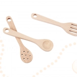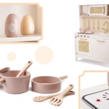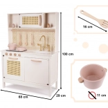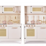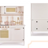 Ez a retro és boho stílus ihlette fa gyerekkonyha a fehér, krémszín és arany részletek elegáns kombinációjával hódít. Az elemek többsége fából/MDF-ből készült, felülete simára csiszolt és nem mérgező festékkel kezelt a biztonságos játék érdekében. A forgatható gombok, a nyitható ajtók és a szerszámakasztók felfedezésre hívnak, és rend- valamint rendszeretet tanítanak.