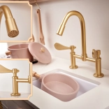 A mély mosogató fémesen aranyló csappal és dupla karral támogatja a mosogatós és előkészítős szerepjátékot. A praktikus polcok és szekrények mindent kézre tartanak.