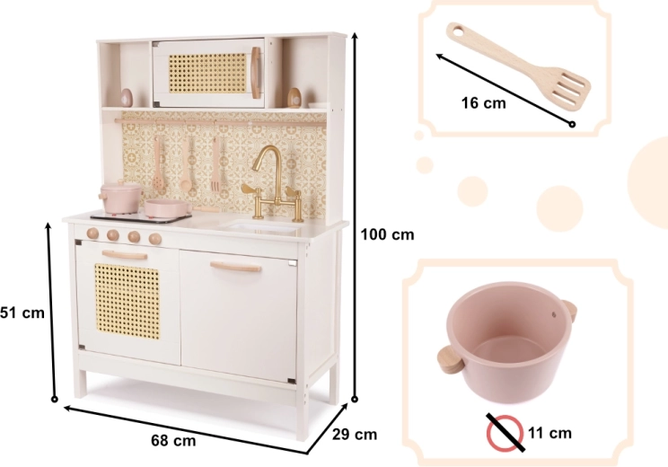Átgondolt tárolóhelyek és praktikus kiegészítők – fedős fazék, serpenyő, só és bors, merőkanál, szűrőkanál és lapát – segítenek rendben tartani a „konyhát”, és megtanítják a gyerekeket a térszervezésre. A legtöbb elem fából készült, a felület simára csiszolt, és nem mérgező festékkel kezelt a maximális biztonság érdekében.
