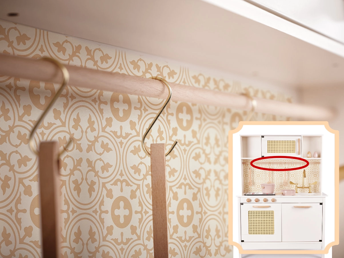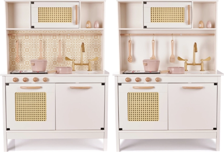 Támogassa gyermeke fantáziáját és finommotorikáját egy konyhával, amely úgy néz ki, mint az igazi. A forgatható fa gombok, a nyitható ajtók, az akasztós sín és a kivehető főzőlap-panel fény- és hangeffektekkel szórakoztatóvá és kockázatmentessé teszik a főzést. A kétoldalas hátlap (sima krémszínű/díszes tapéta) lehetővé teszi, hogy hangulat szerint változtassa a konyha megjelenését.