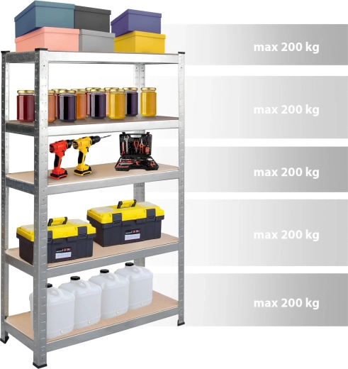 A HUMBERG univerzális raktári polc 150 × 75 × 30 cm méretben megerősített szerkezettel, 5 db masszív MDF polccal (5 mm) és polconként akár 200 kg teherbírással (összesen 1000 kg) rendelkezik. A csavarmentes, bepattintható szerelésnek, a állítható polcoknak és a két kisebb állványra bontható kialakításnak köszönhetően ideális garázsba, műhelybe, pincébe, irattárba és üzletbe is.