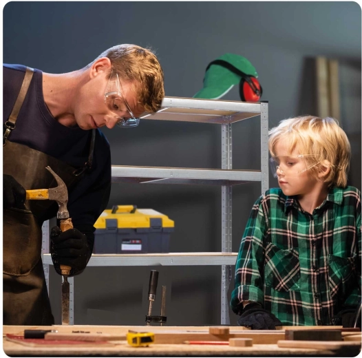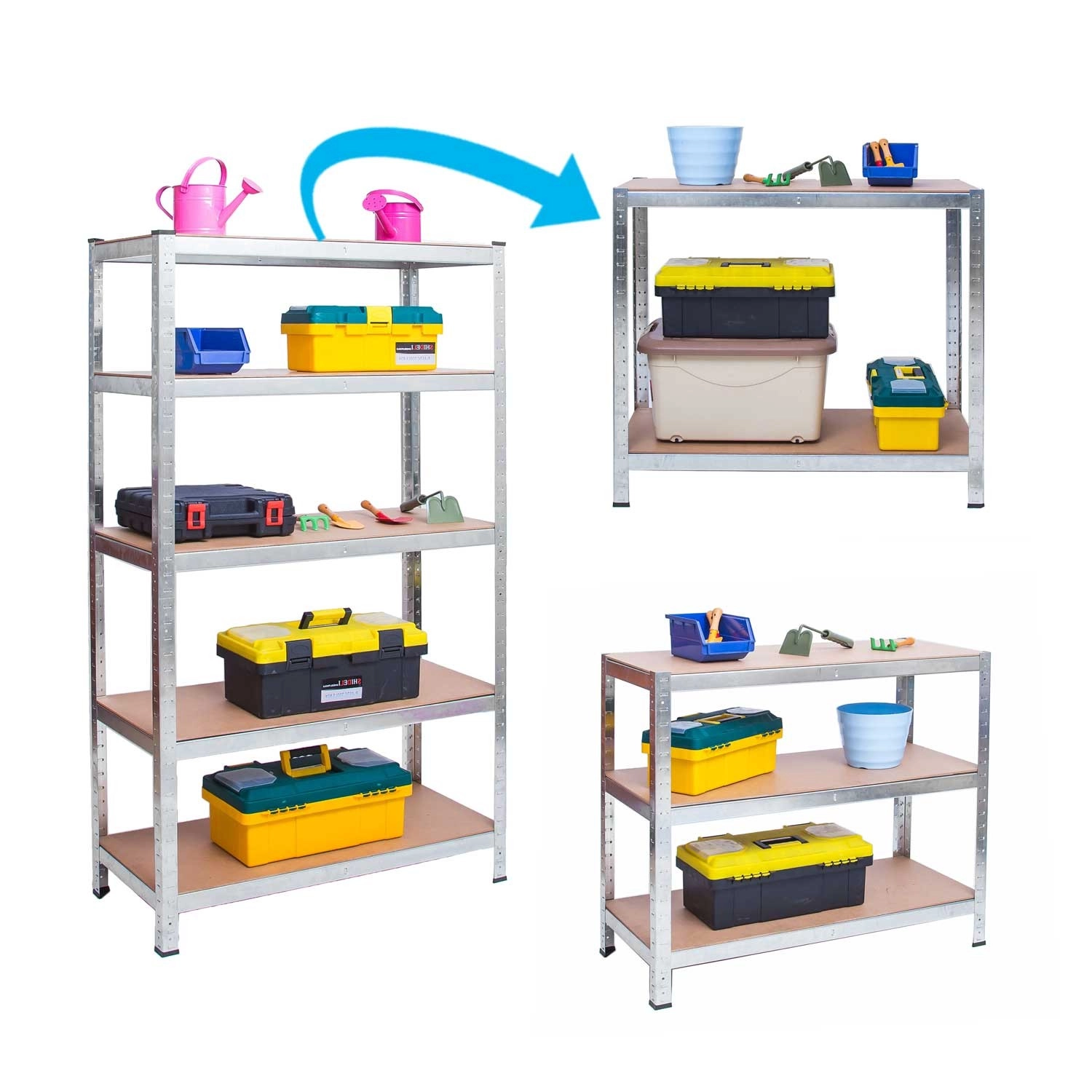 A polcok magassága 40 mm-es lépésekben állítható, a teljes egység pedig két kisebbre bontható. Így könnyedén kihasználhatja a helyet a garázsban, műhelyben vagy pincében.