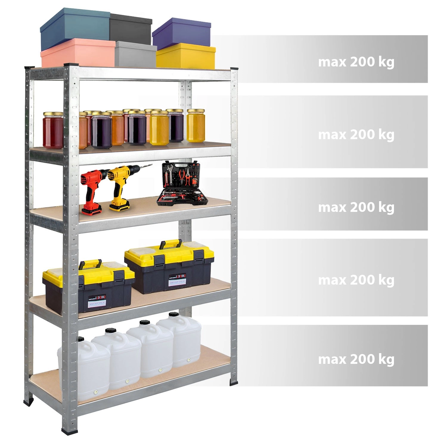 A HUMBERG polcrendszert mindennapos igénybevételre és szerszámok, dobozok, készletek áttekinthető tárolására tervezték. A 0,8 mm vastag, horganyzott acélprofilok kivételes stabilitást és hosszú élettartamot biztosítanak, míg az öt, 5 mm vastag MDF polc középső merevítésekkel biztonsággal elbírja a nehéz tárgyakat. A csavarmentes rendszer gyors és egyszerű szerelést tesz lehetővé szerszámok nélkül.