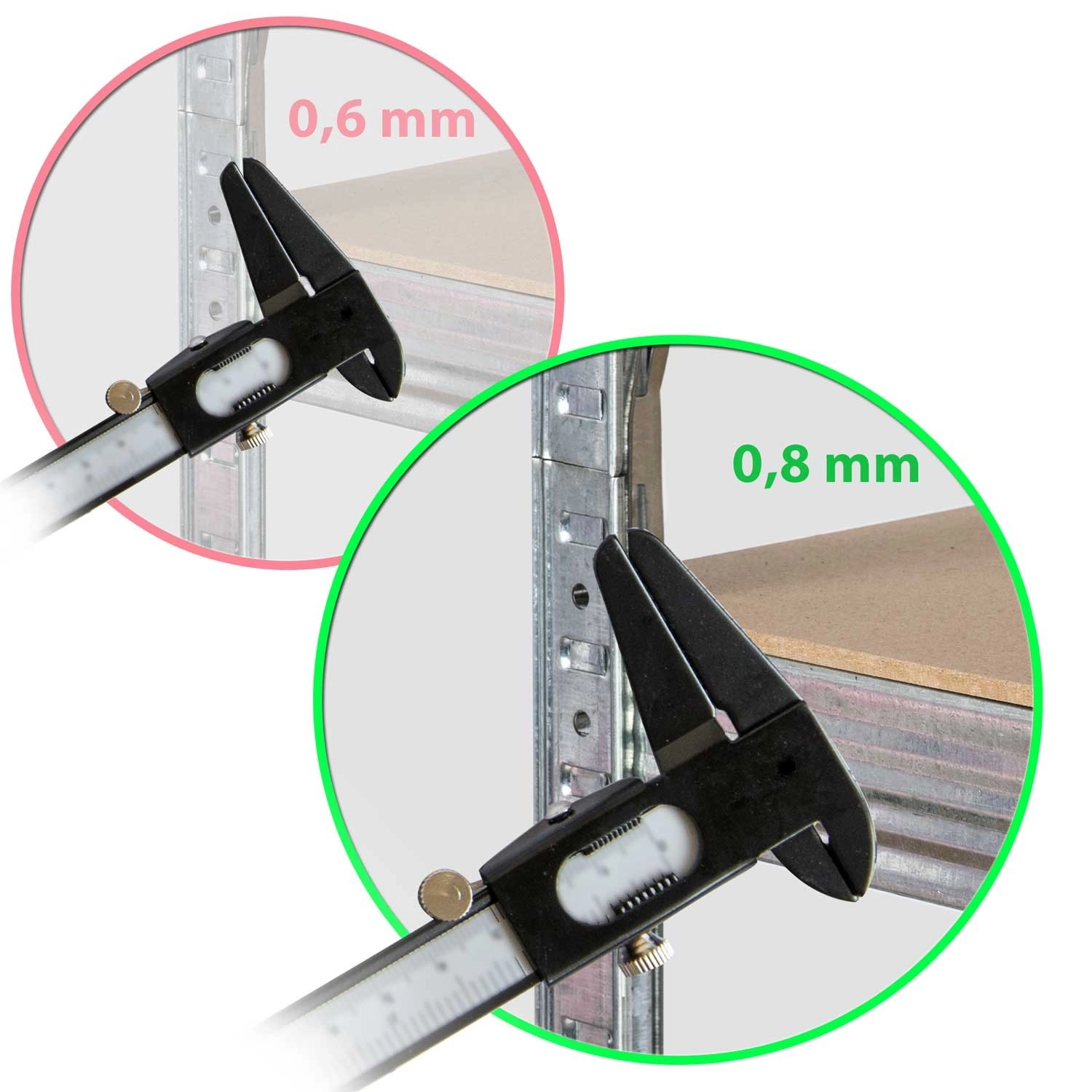 A 0,8 mm vastag, horganyzott acélprofilok és a polcok középső merevítései nagyfokú stabilitást és hosszú élettartamot biztosítanak teljes terhelés mellett is.