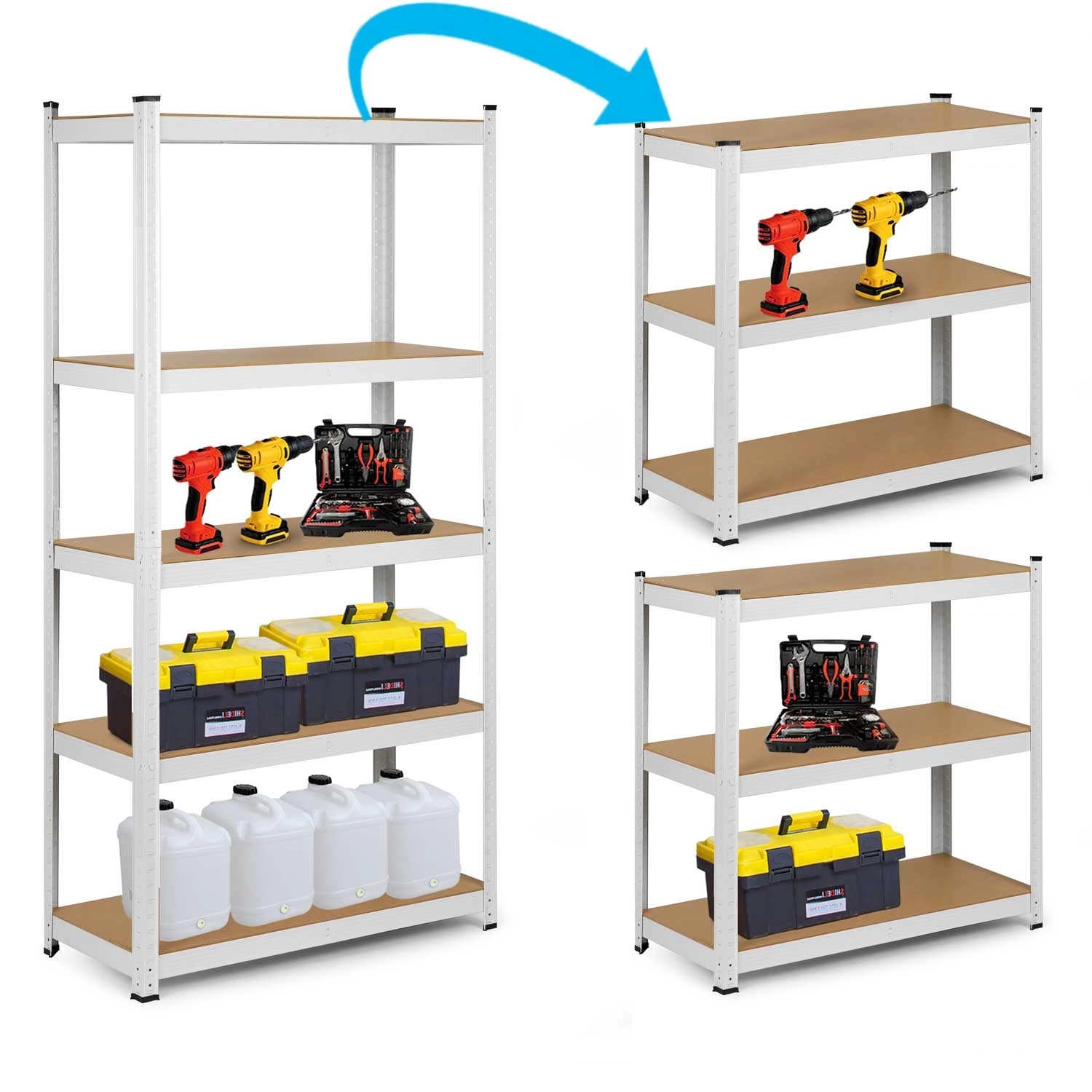 A polcrendszer könnyedén két alacsonyabb állvánnyá alakítható, vagy stabil munkapadként is használható – a szerelés csavarok nélkül, gyorsan elvégezhető.