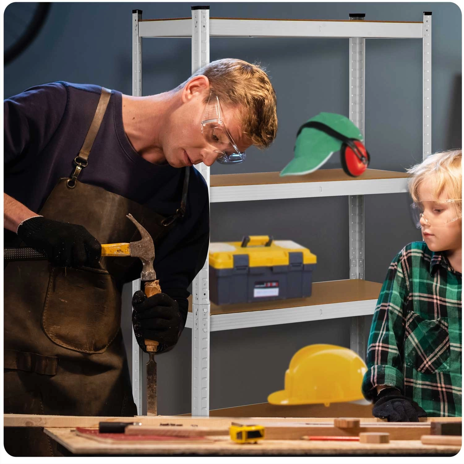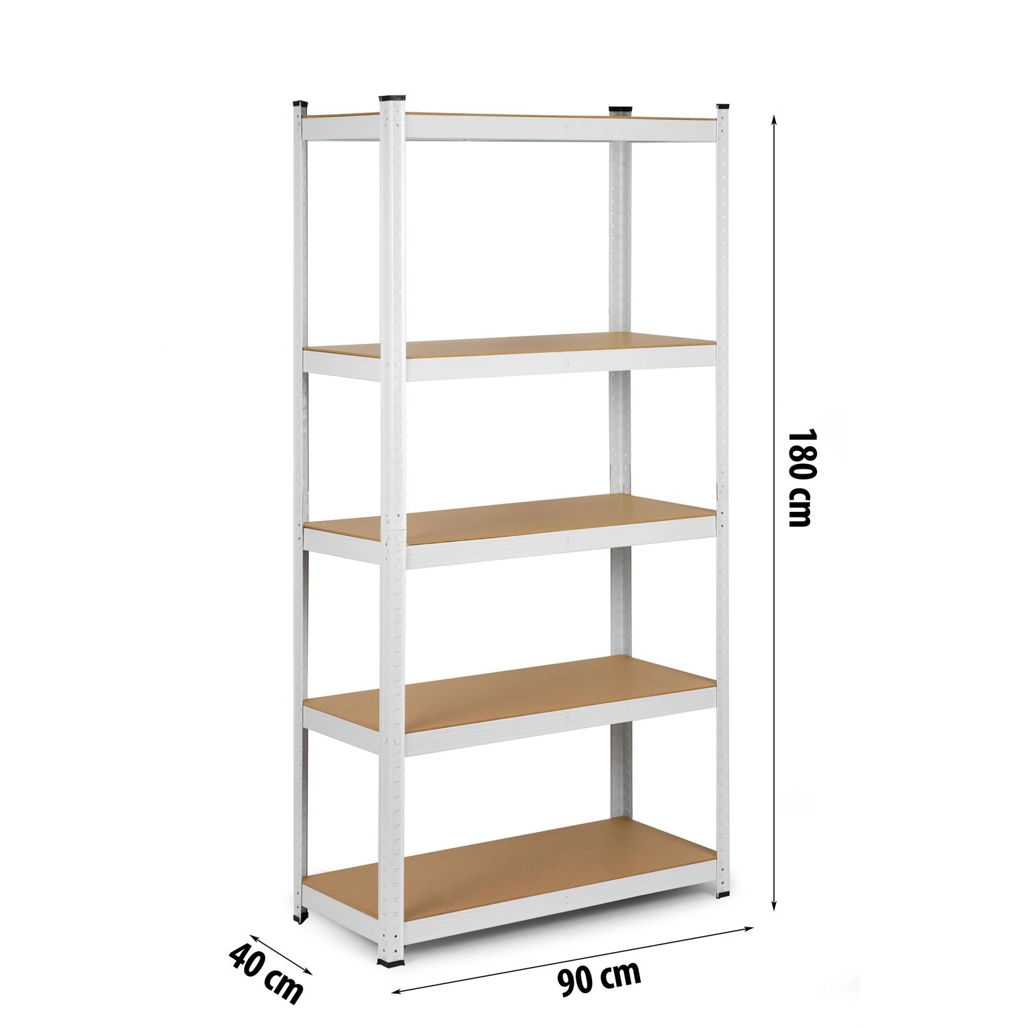 Öt masszív MDF polc középső merevítésekkel polconként 175 kg-ot bír el – ideális szerszámokhoz, ládákhoz és készletekhez.