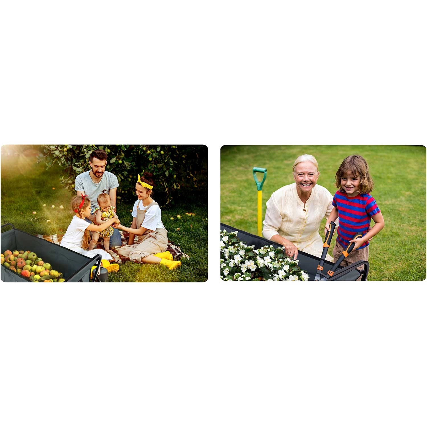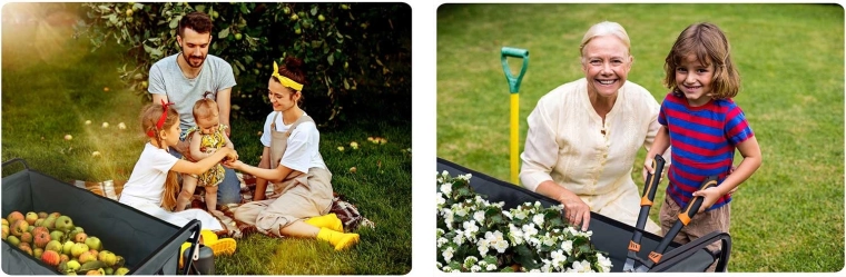 Használata intuitív és kényelmes. A forgó első kerekek növelik a fordulékonyságot, a hosszú fogantyú puha, csúszásmentes markolattal biztos fogást ad. A két integrált italtartó zseb termoszhoz vagy palackhoz is ideális. Munka után a kocsi villámgyorsan kompakt méretre hajtható, és elfér az autó csomagtartójában vagy a tárolóban.