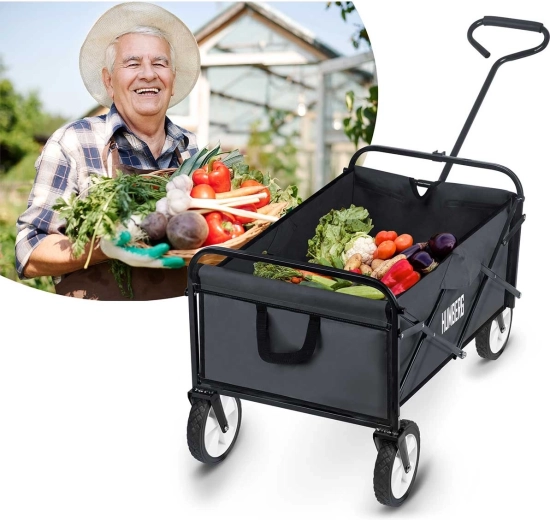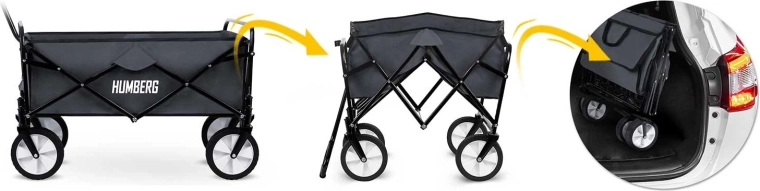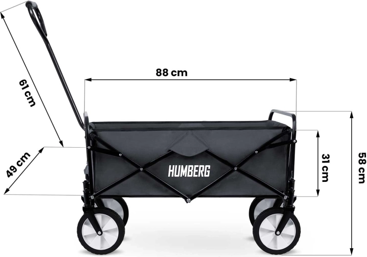 Megbízható kocsit keres kerti munkához, hétvégi kirándulásokhoz, fesztiválokra vagy családi bevásárláshoz? A HUMBERG összecsukható kocsi a masszív felépítést maximális praktikummal ötvözi. A porszórt acélváz hosszú élettartamot biztosít, míg a tartós textil gyorsan szárad és könnyen karbantartható. Szükség esetén a huzat egyszerűen lecsatolható a váztól.
