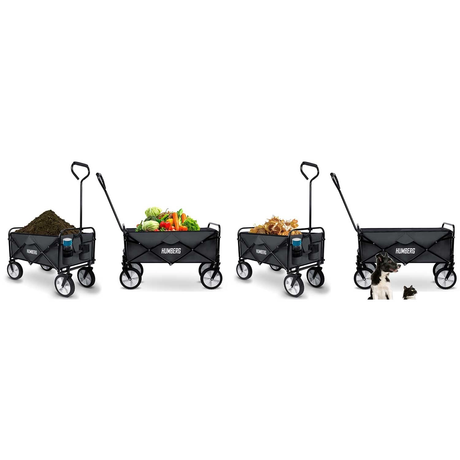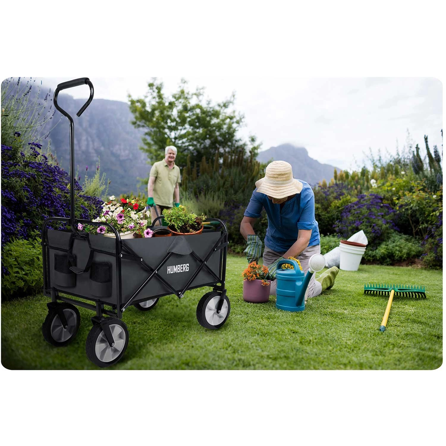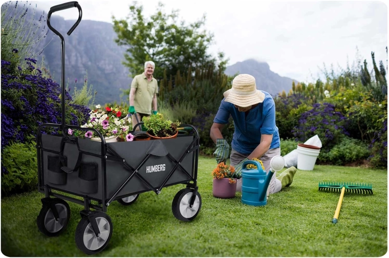 A univerzális, összecsukható HUMBERG kocsi ideális segítőtárs a kertbe, vízpartra és bevásárláshoz. 80 l űrtartalmat, akár 90 kg teherbírást, porszórt acél vázat és gyors összehajtást kínál kompakt méretre. A kényelmes, teleszkópos, puha csúszásmentes markolatú fogantyú és a forgó első kerekek révén teljes terhelésnél is könnyen irányítható. Találhatók rajta praktikus italtartó zsebek, a strapabíró, könnyen tisztítható textil pedig hosszú élettartamú.