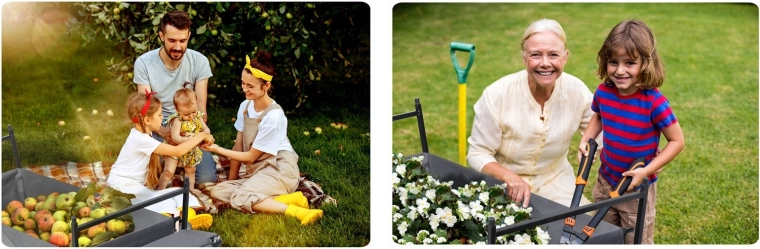 A tető magassága könnyen a szállított tárgyakhoz igazítható. Árnyékot és alapvető időjárásvédelmet nyújt, így biztonságosan szállíthat érzékeny növényeket vagy felszerelést is.