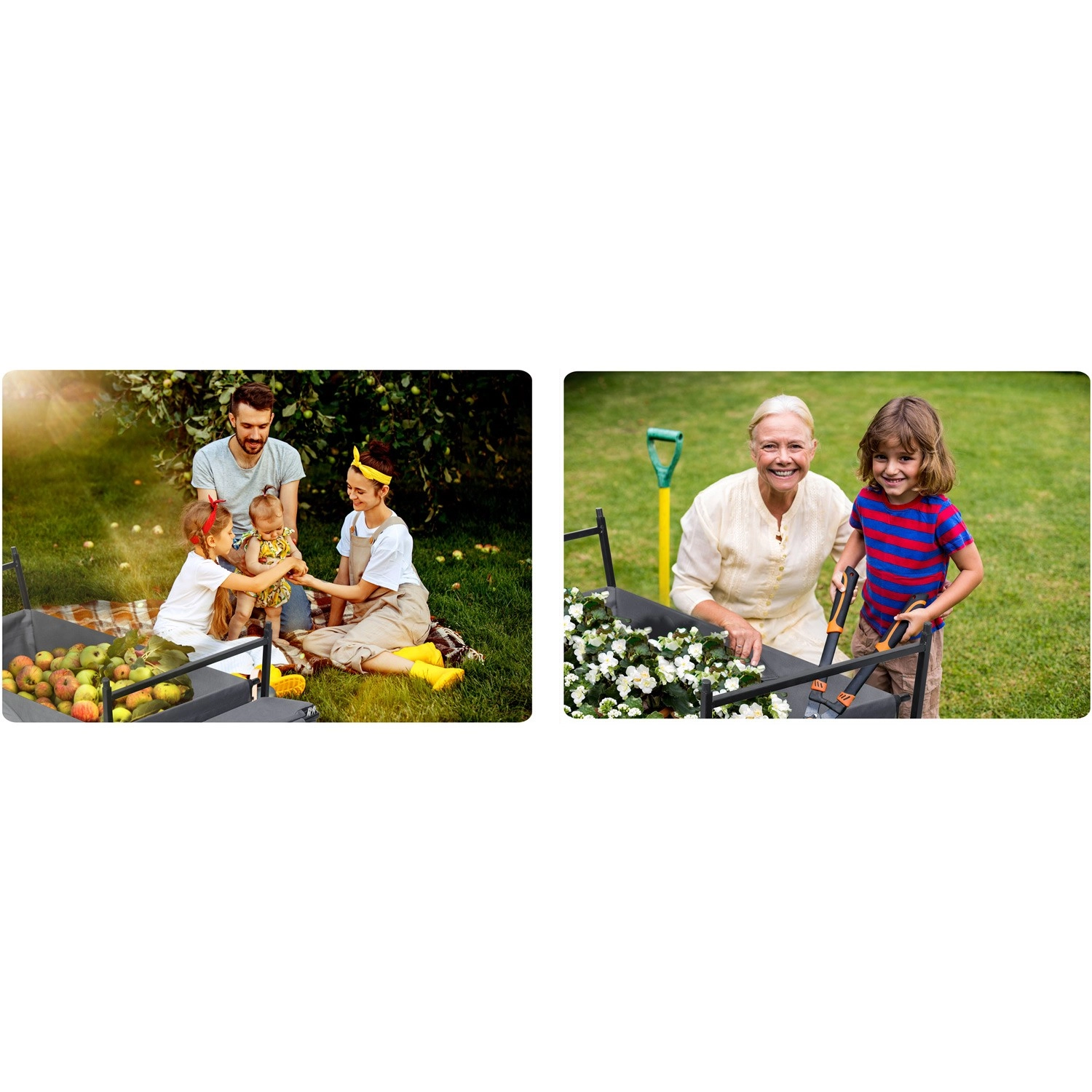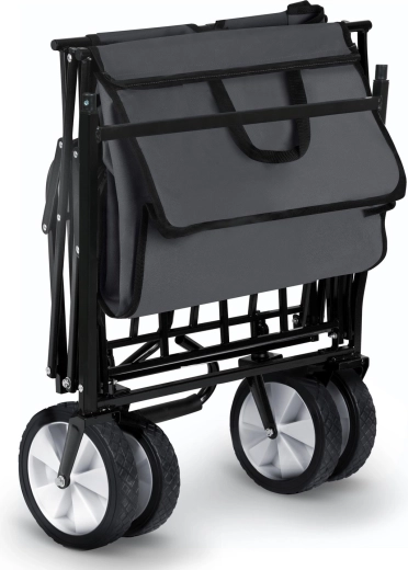 A puha, csúszásmentes huzattal ellátott fogantyú biztos fogást nyújt teljes terhelés mellett is. Az első forgó kerekek megkönnyítik a kanyarodást és a pontos irányítást. Munka után a kocsit pillanatok alatt kompakt formára csukhatja, és magával viheti autóba, nyaralásra, vagy elrakhatja a szekrénybe.