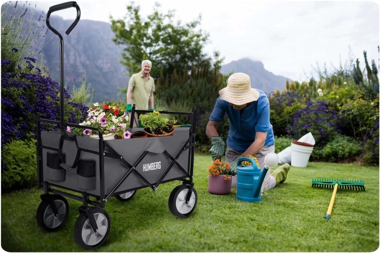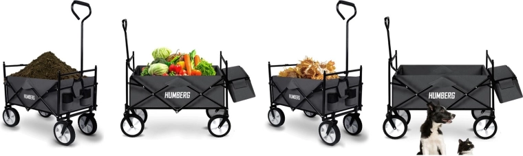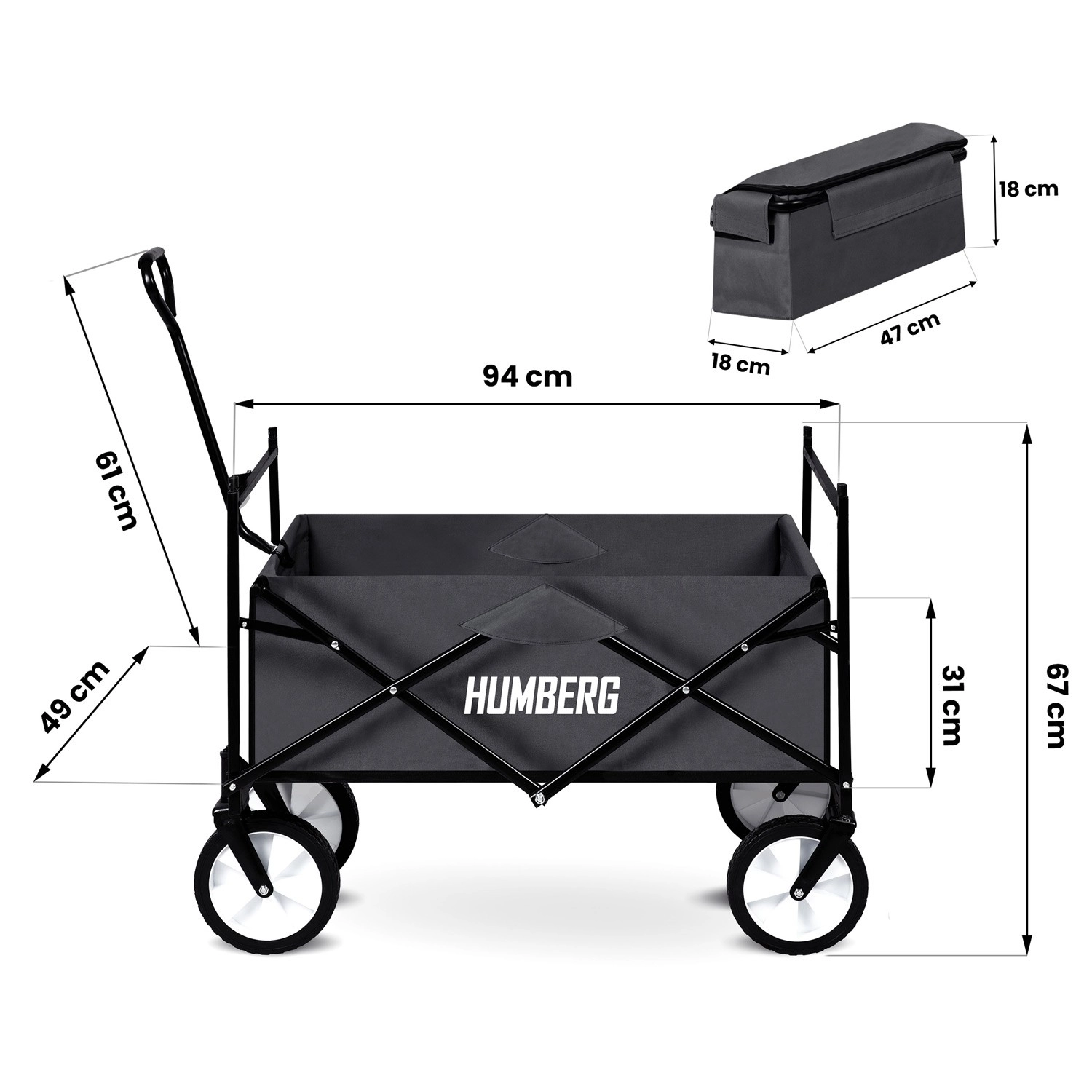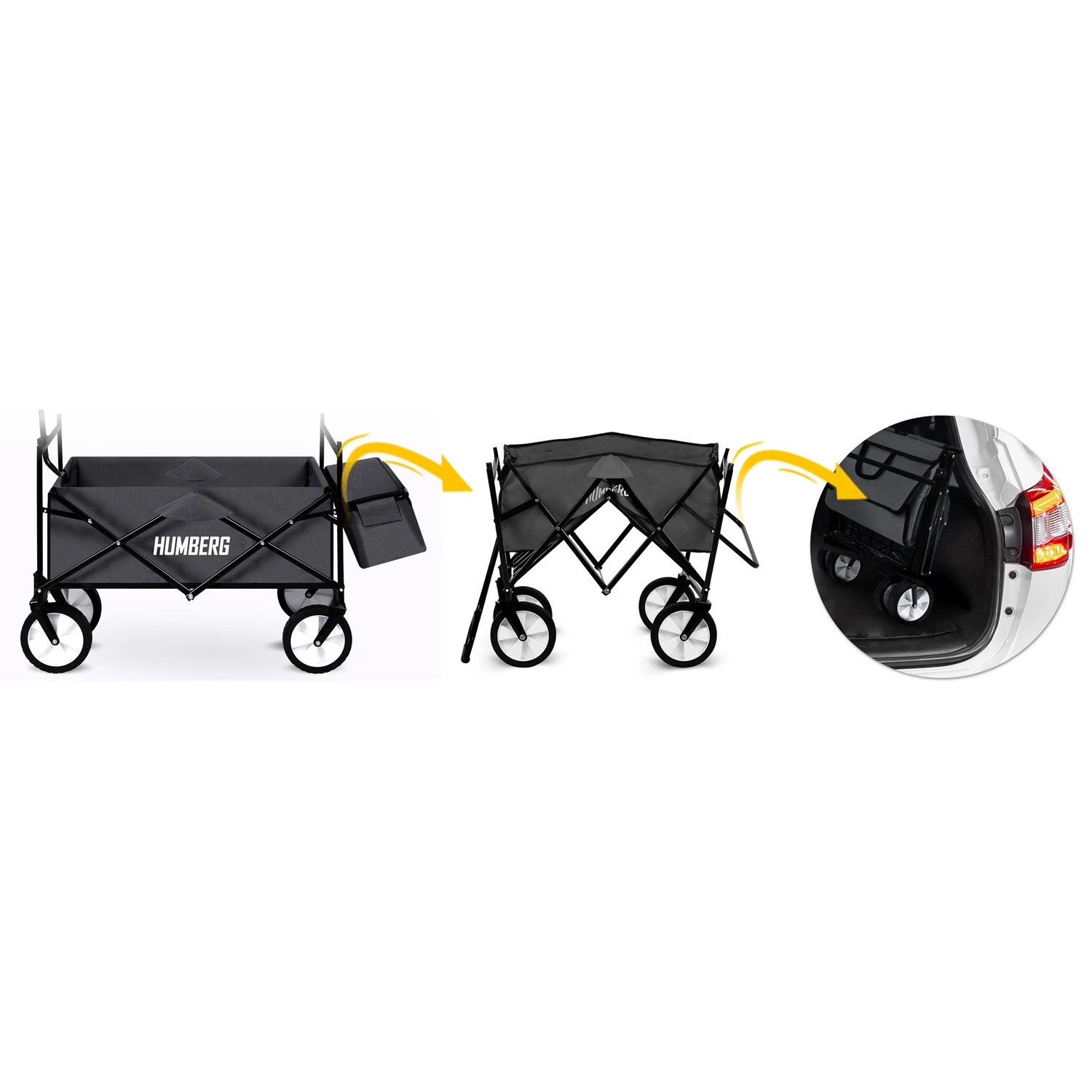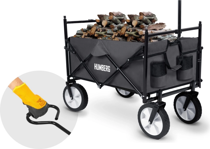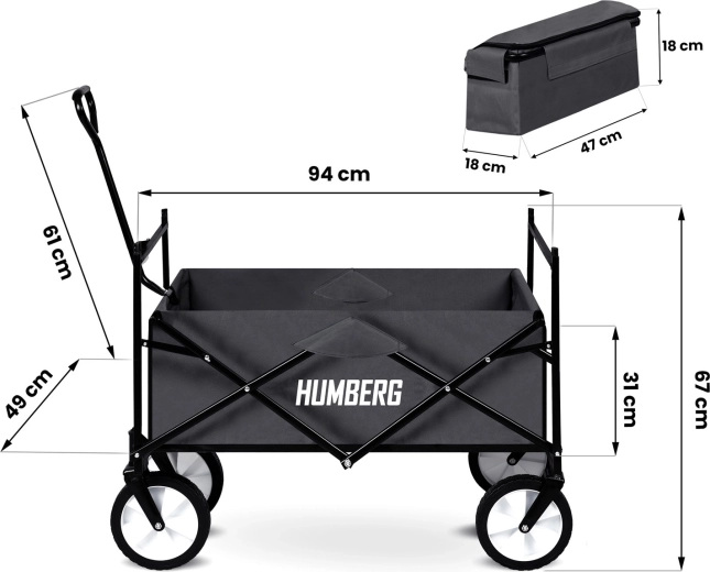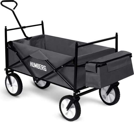 A praktikus, 80 l űrtartalmú és 90 kg teherbírású HUMBERG összecsukható kocsi megkönnyíti a rakomány szállítását a kertben, kirándulásokon és a strandon. Állítható tetővel rendelkezik a nap és az eső ellen, tartós acél vázzal porfestett felülettel, kényelmes teleszkópos fogantyúval csúszásgátló bevonattal, valamint levehető cipzáras kiegészítő zsebbel apróságok számára. Az első forgó kerekek könnyű manőverezést biztosítanak, a szerkezet pedig gyorsan összecsukható kompakt méretre az egyszerű hordozás és tárolás érdekében.