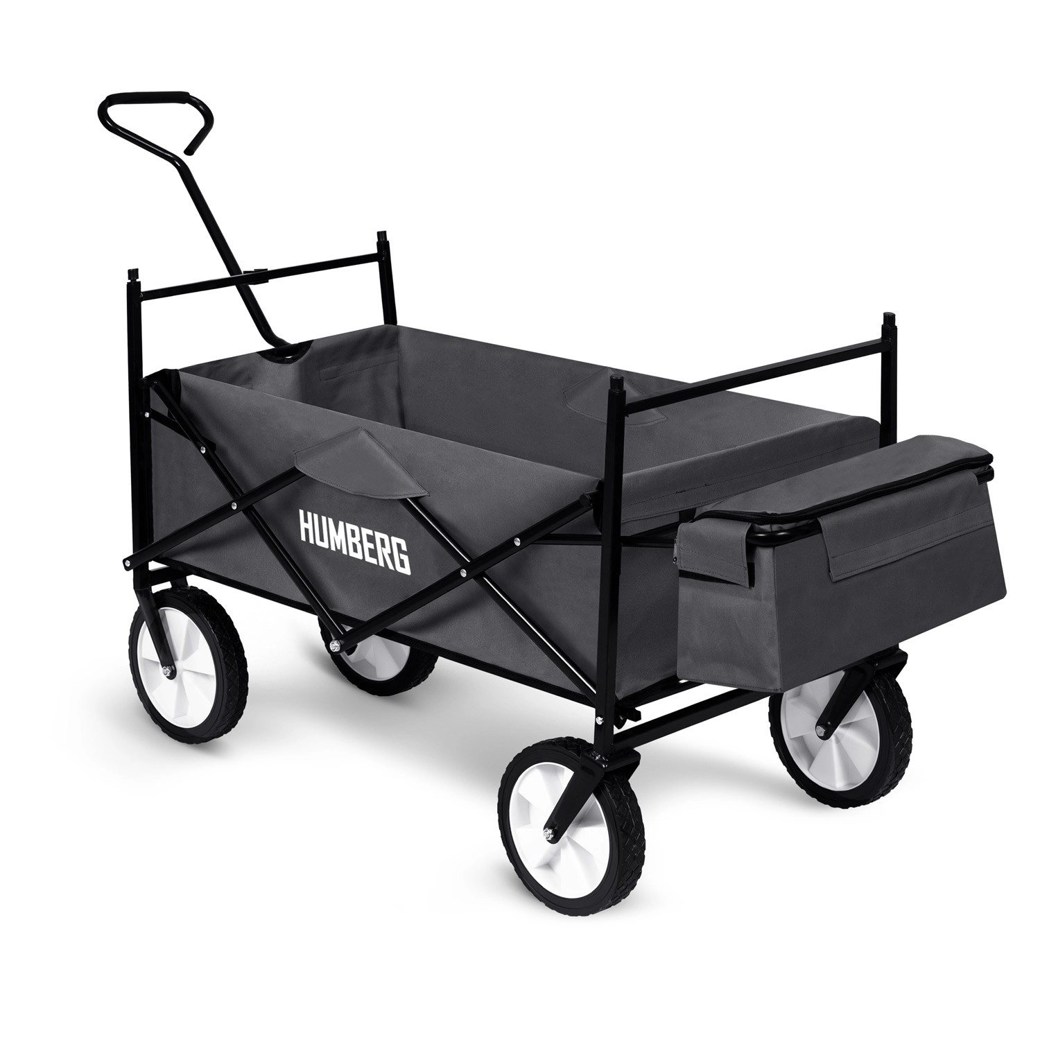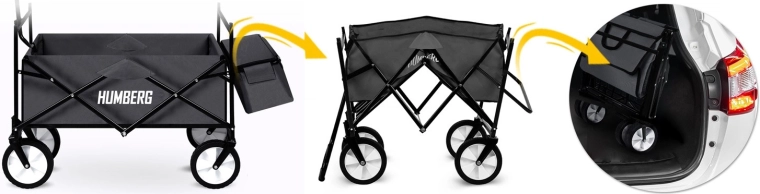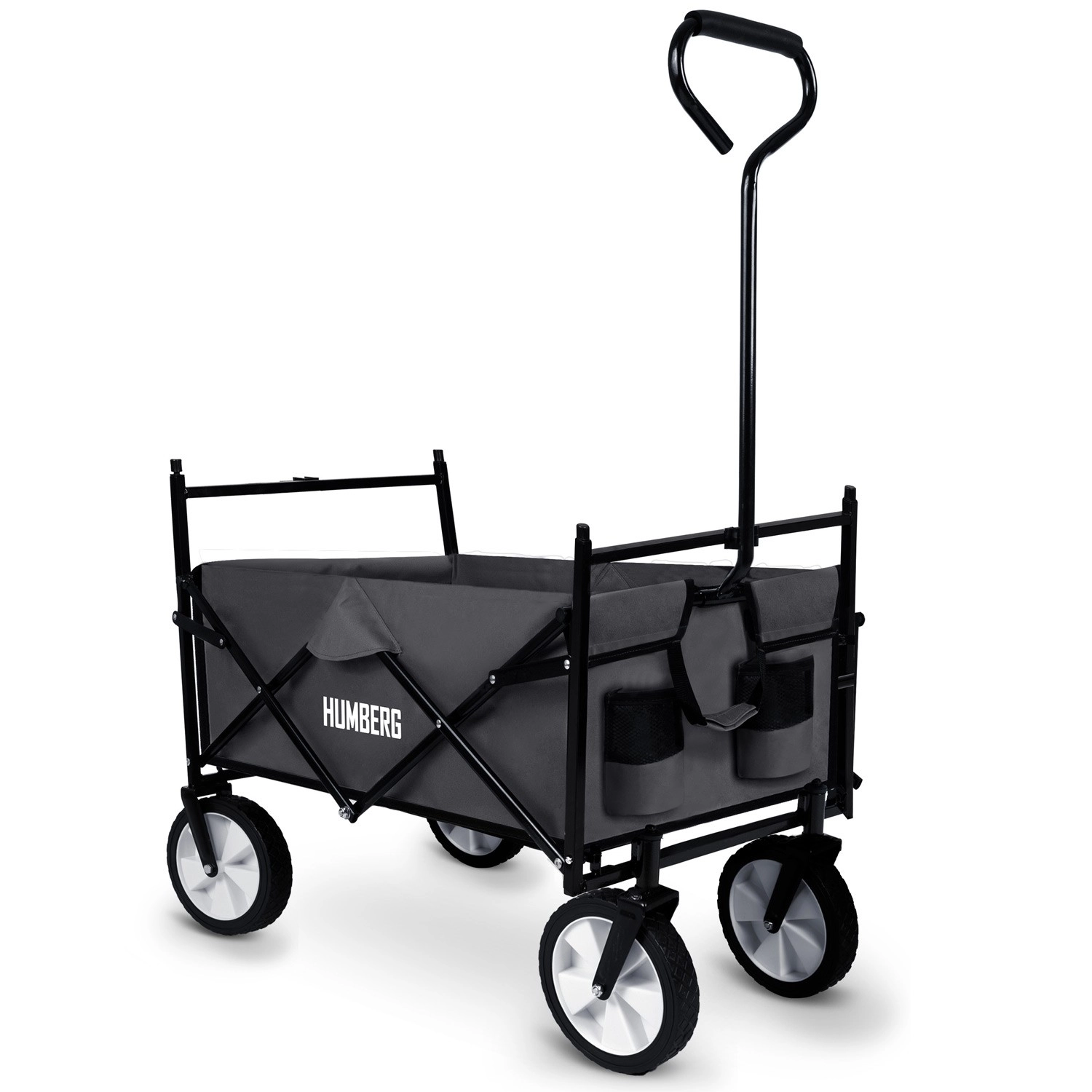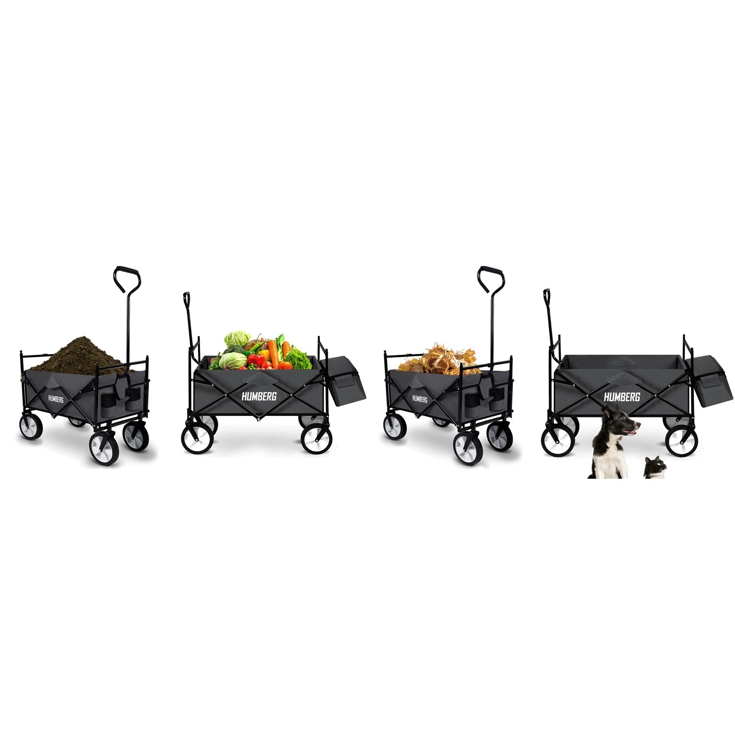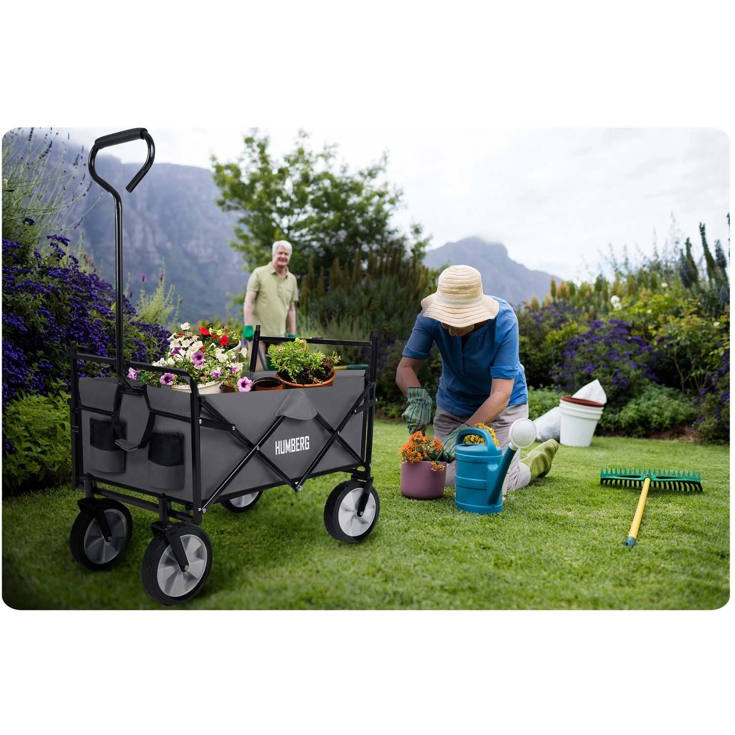A praktikus, 80 l űrtartalmú és 90 kg teherbírású HUMBERG összecsukható kocsi megkönnyíti a rakomány szállítását a kertben, kirándulásokon és a strandon. Állítható tetővel rendelkezik a nap és az eső ellen, tartós acél vázzal porfestett felülettel, kényelmes teleszkópos fogantyúval csúszásgátló bevonattal, valamint levehető cipzáras kiegészítő zsebbel apróságok számára. Az első forgó kerekek könnyű manőverezést biztosítanak, a szerkezet pedig gyorsan összecsukható kompakt méretre az egyszerű hordozás és tárolás érdekében.