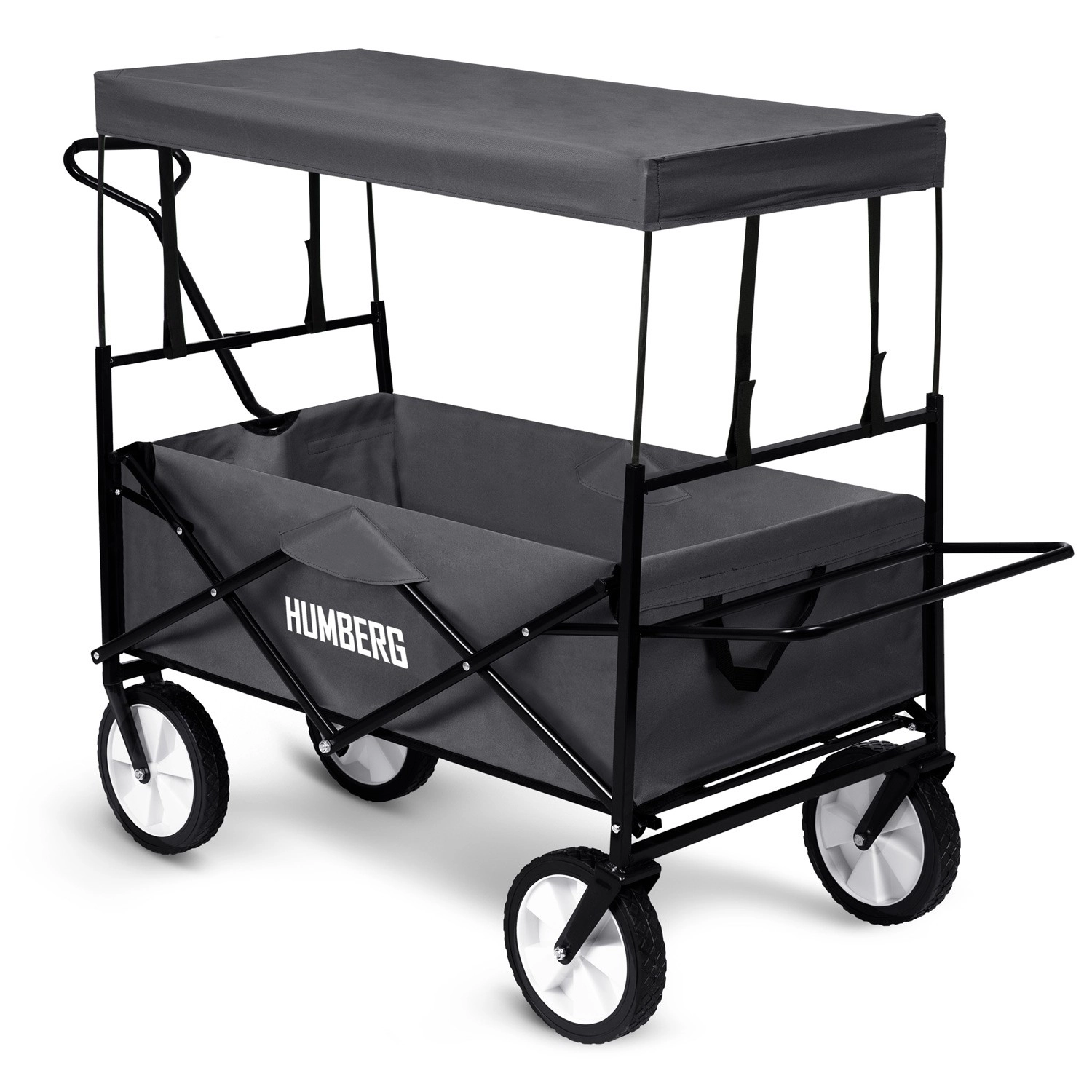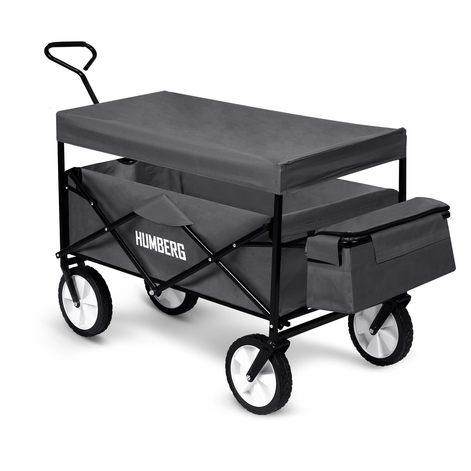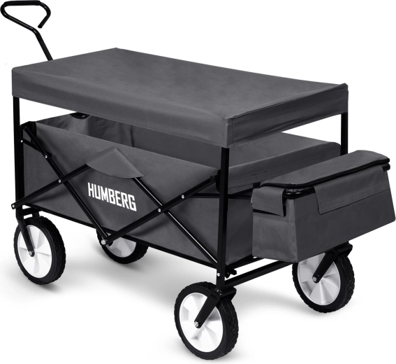 Sokoldalú segítséget keres a rakomány szállításához? A HUMBERG összecsukható kocsi tágas, 80 l-es textilkosarat, erős acél vázat és nagy kerekeket kínál a stabil haladáshoz különböző felületeken. Az állítható tető megóvja a tartalmat a naptól és az enyhe esőtől, így az érzékeny tárgyak szállítása is komfortos marad.