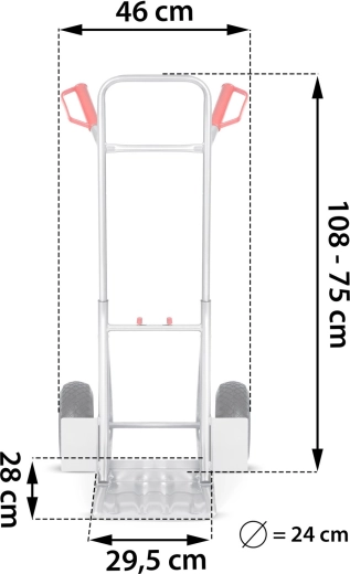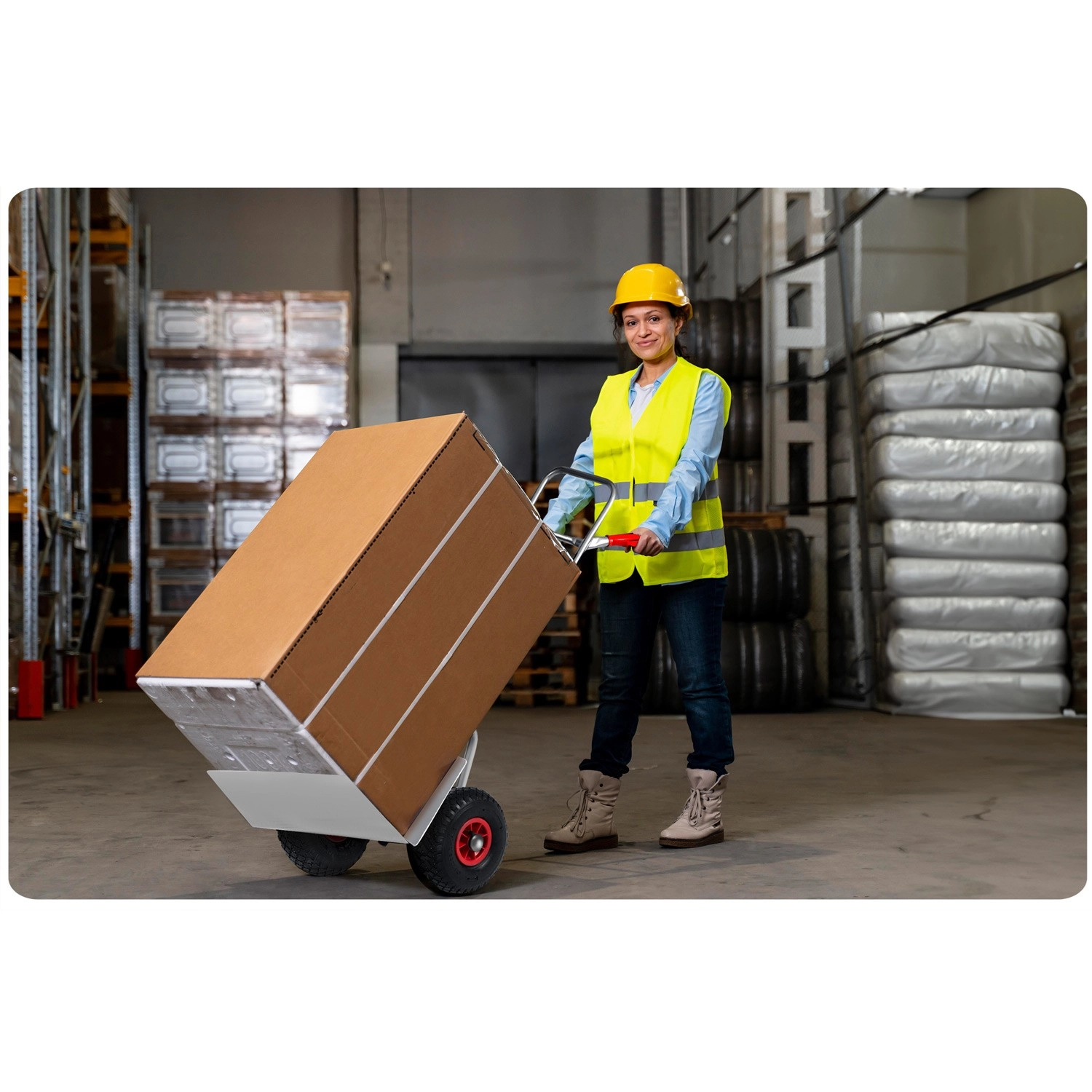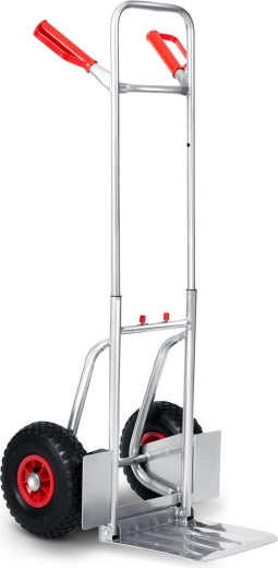 A 75–108 cm állítható magasságnak és az összecsukható alsó platformnak köszönhetően könnyen a rakomány méretéhez igazítható, és helyet takarít meg a tárolásnál. A horganyzott acél váz ellenáll a korróziónak és a kopásnak, a PVC fogantyúk pedig kényelmes, biztonságos fogást nyújtanak hosszabb használat során is.