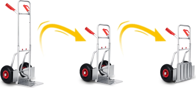 Az alsó platform gyorsan lehajtható, a kocsi pedig könnyen elfér az autó csomagtartójában vagy a polcon – ideális futároknak és költözéshez.