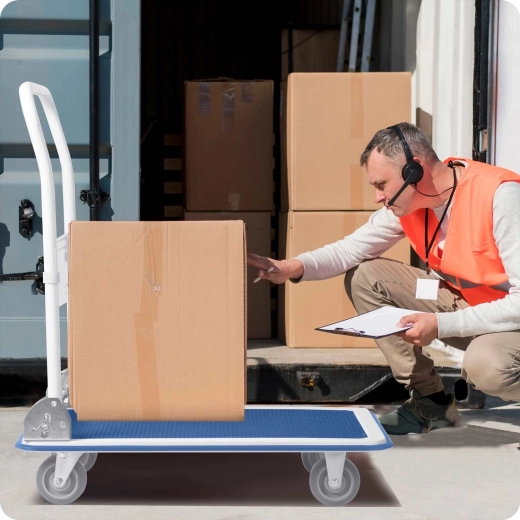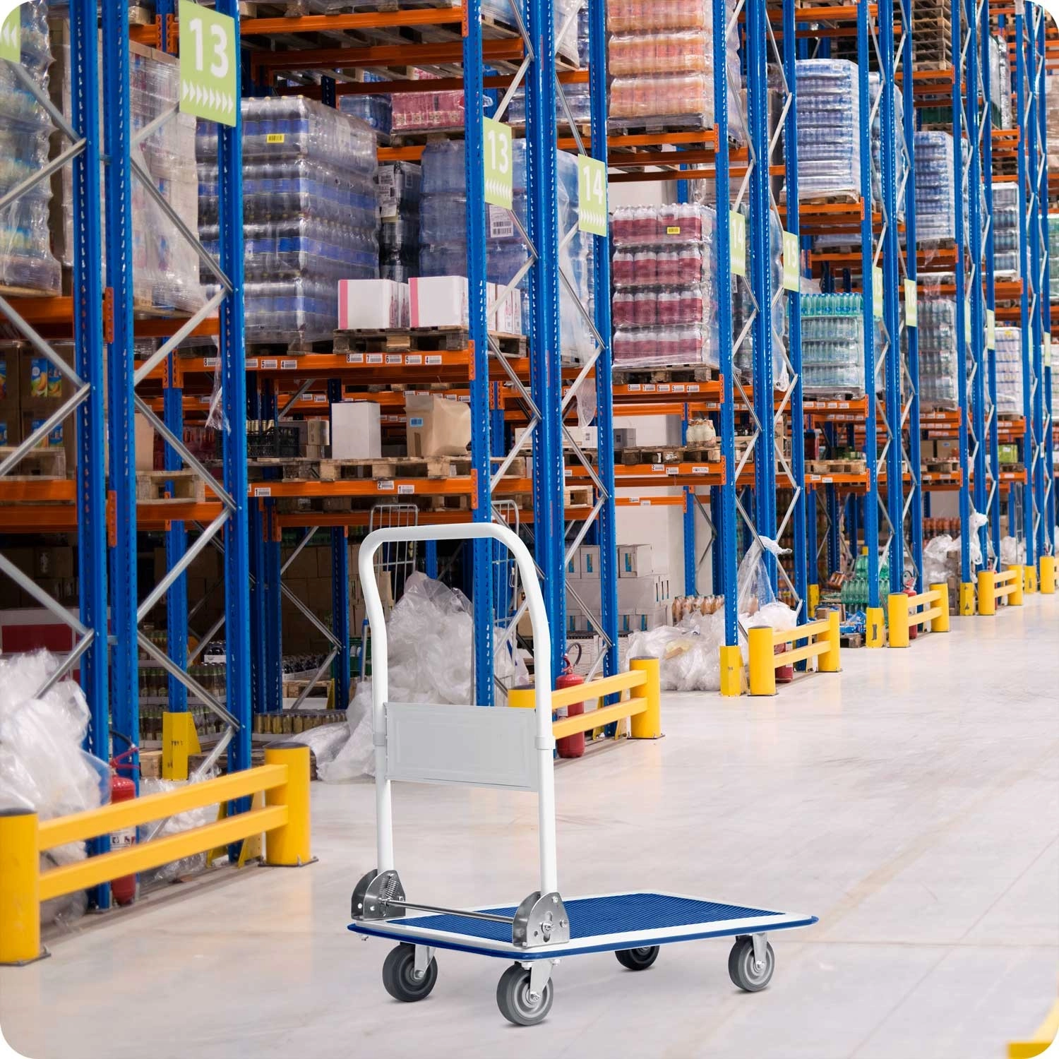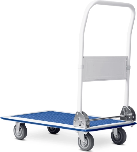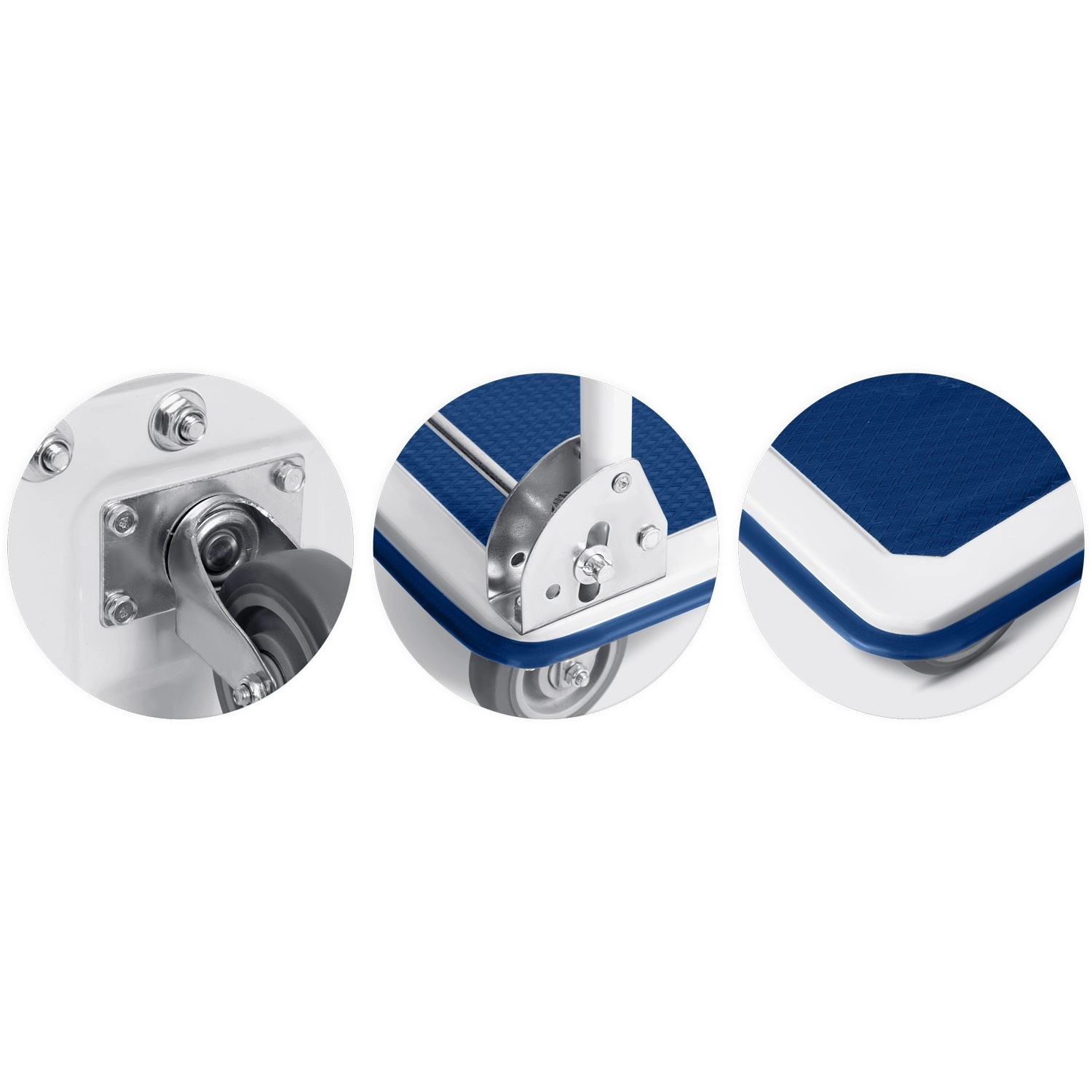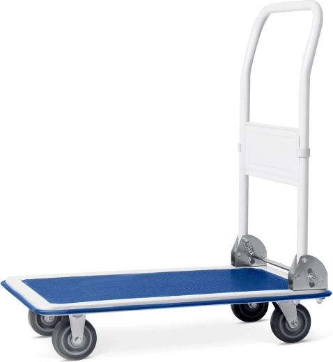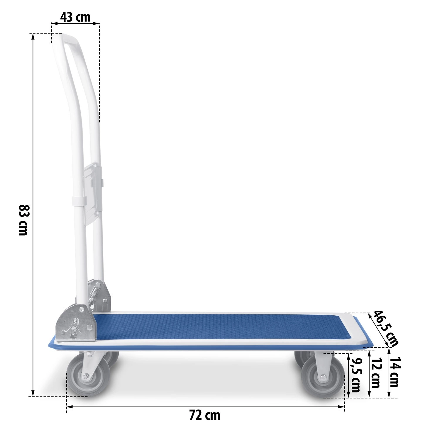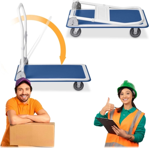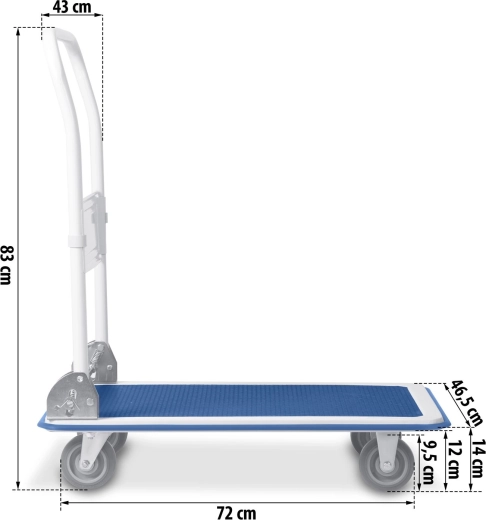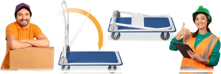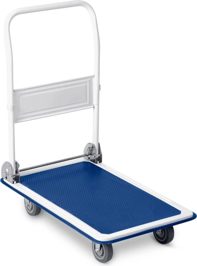 A lehajtható fogantyúnak köszönhetően a kocsi könnyen elfér polcon vagy az autó csomagtartójában, porszórt acél váza pedig ellenáll az intenzív igénybevételnek. A védő gumiperem tompítja az ütközéseket és megóvja a bútorokat, falakat a karcolásoktól költöztetéskor.