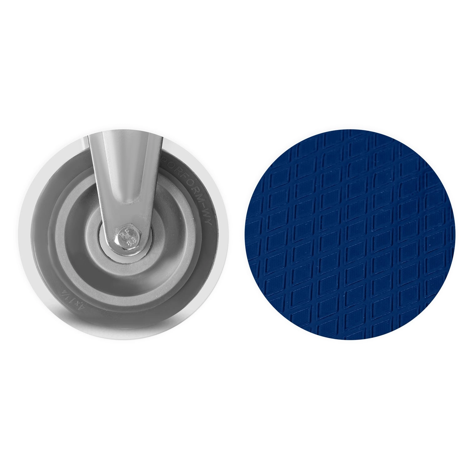 Két teljesen 360°-ban forgó kerék és a masszív fém rögzítés sima és csendes gördülést biztosít még nagyobb terhelésnél is, valamint pontos manőverezést szűk helyeken.