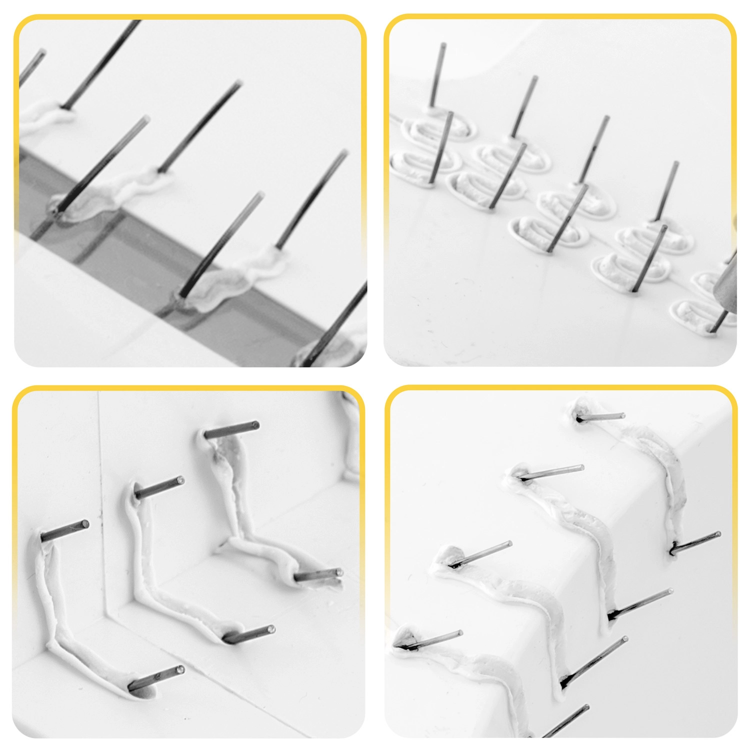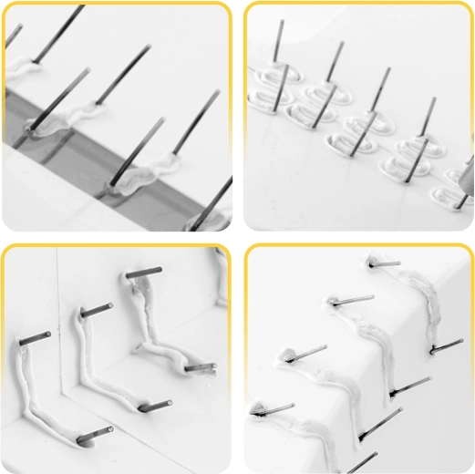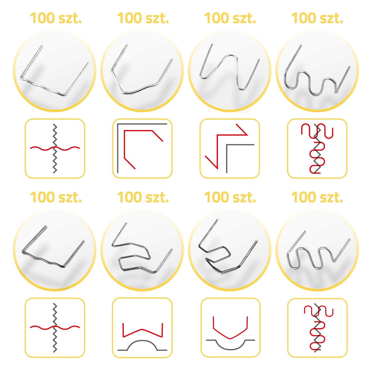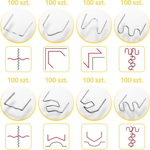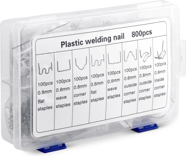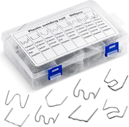 Ezzel a készlettel kijavíthatók repedt lökhárítók, fényszóróburkolatok, belső tér elemei és háztartási gépek műanyag borításai. A kapcsok különböző formái és méretei lehetővé teszik a repedések erős rögzítését sarkokban, íveken és sík felületeken, vékonyabb és vastagabb anyagok esetén egyaránt. Az ellenálló acélnak köszönhetően a kapcsok stabilak, tartósak és nem rozsdásodnak.