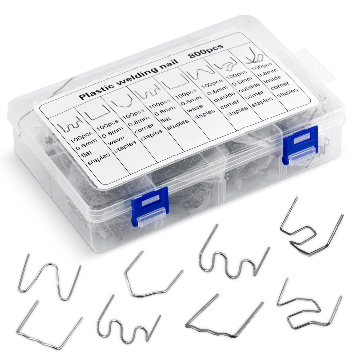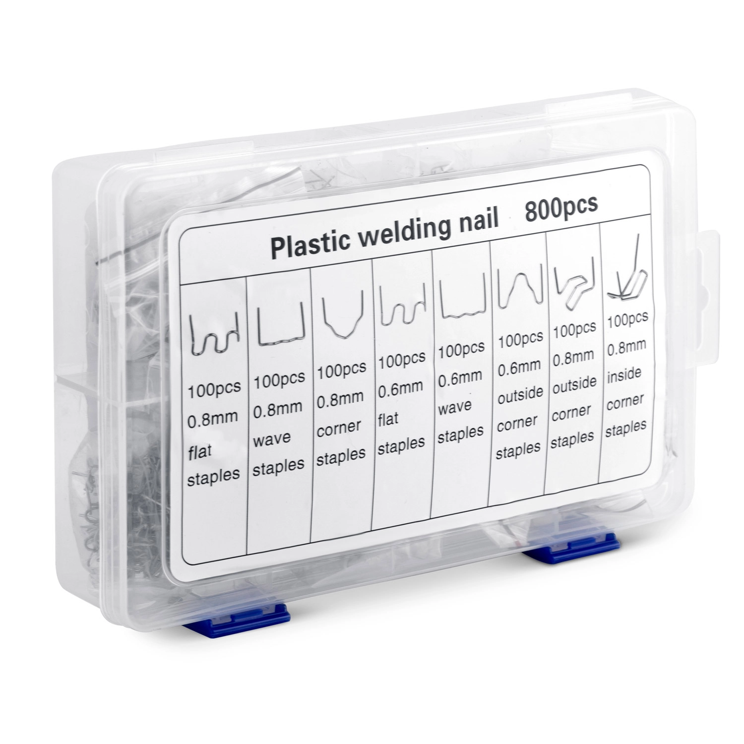 A készlet tartalma úgy lett összeállítva, hogy lefedje a leggyakoribb műanyag-sérüléstípusokat – a keskeny repedésektől a széles törésekig, belső és külső sarkokig, valamint ívelt felületekig. Minden áttekinthető kofferben kap helyet, így a szükséges kapcstípus gyorsan megtalálható.