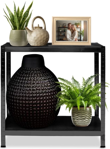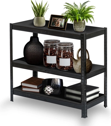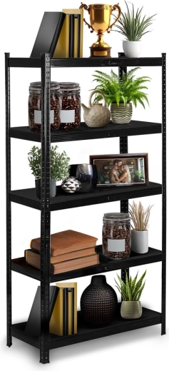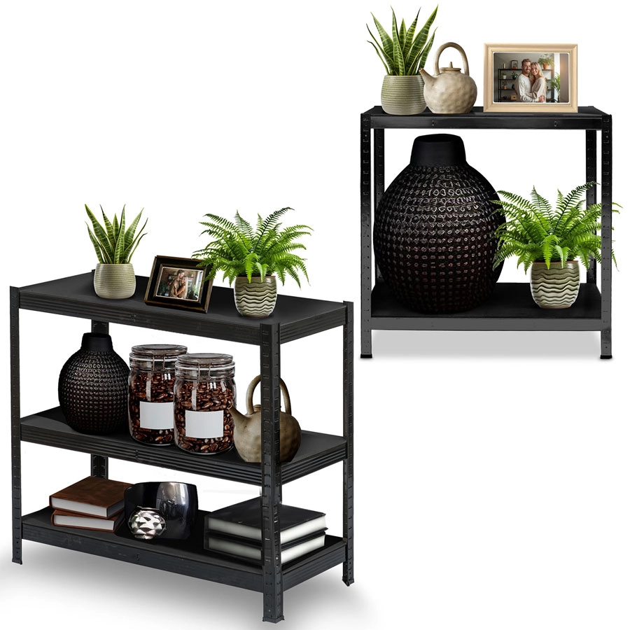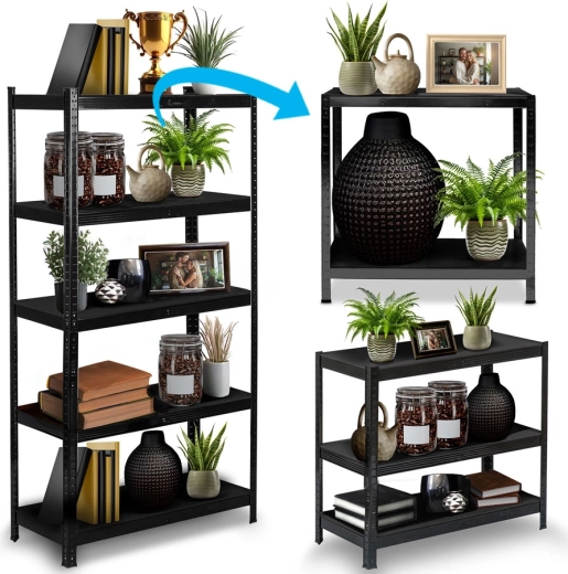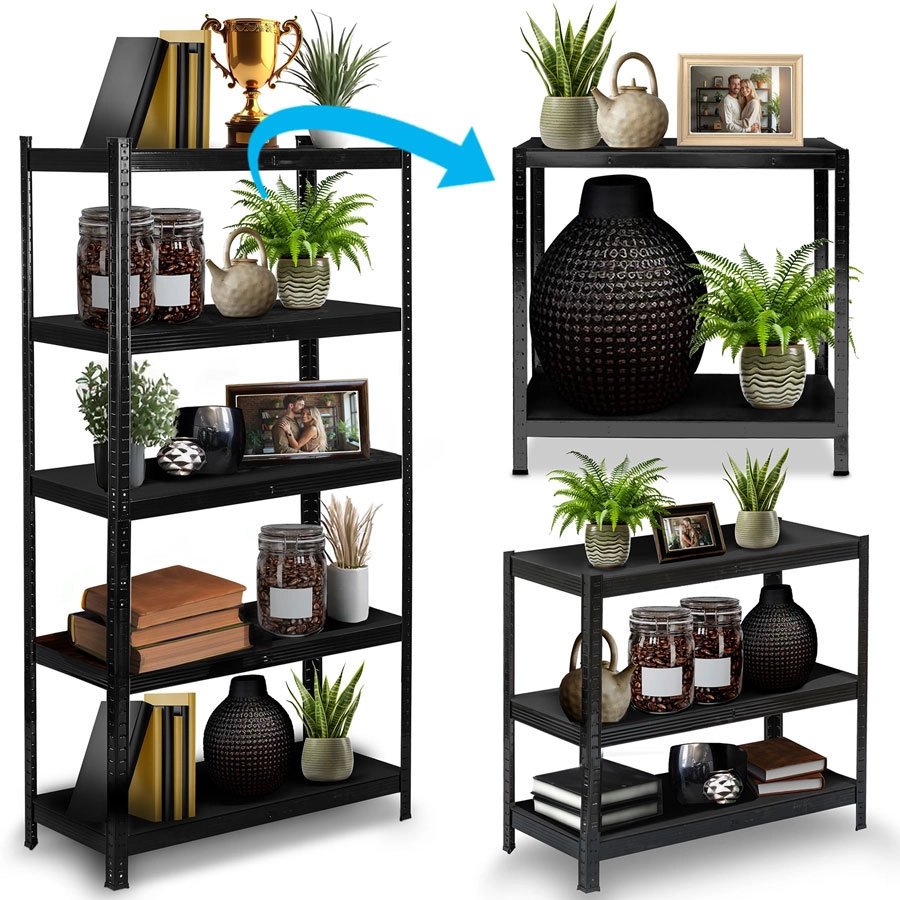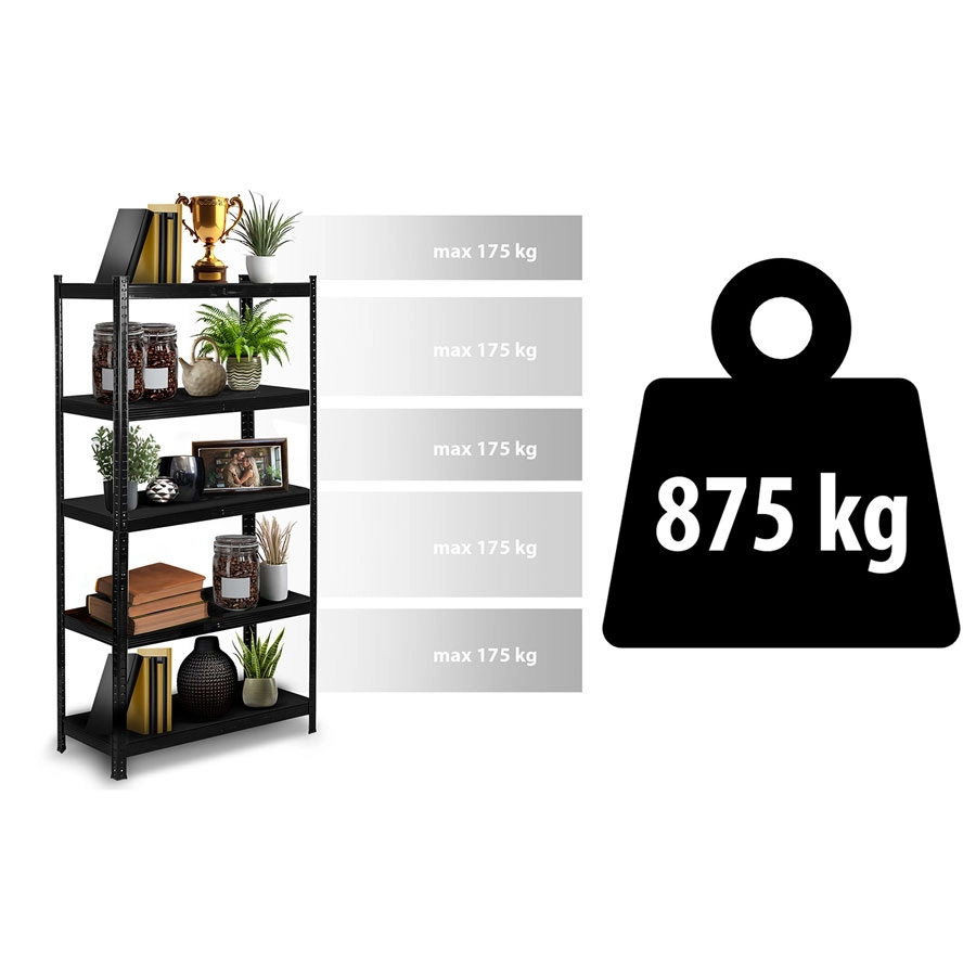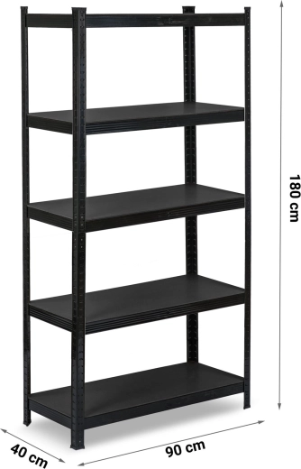 fém polcrendszer 180 × 90 × 40 cm elegáns fekete színben, 5 darab erős MDF polccal, polconként akár 175 kg teherbírással, összesen 875 kg. A csavarmentes, bepattintós szerelésnek, a állítható polcoknak és a két kisebb állvánnyá bontható kivitelnek köszönhetően ideális garázsba, pincébe, irattárba vagy műhelybe. A lekerekített élek és a védő lábvégződések biztonságos és kíméletes használatot biztosítanak.