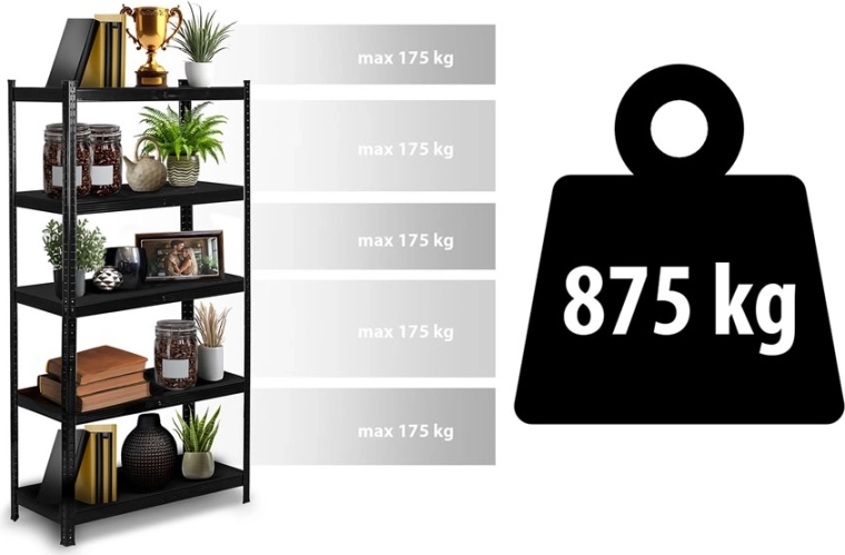 Az 5 polc mindegyike akár 175 kg-ot bír egyenletes terhelés mellett. A dupla középső merevítők növelik a merevséget és a hosszú távú stabilitást nehéz tárgyak tárolásakor.