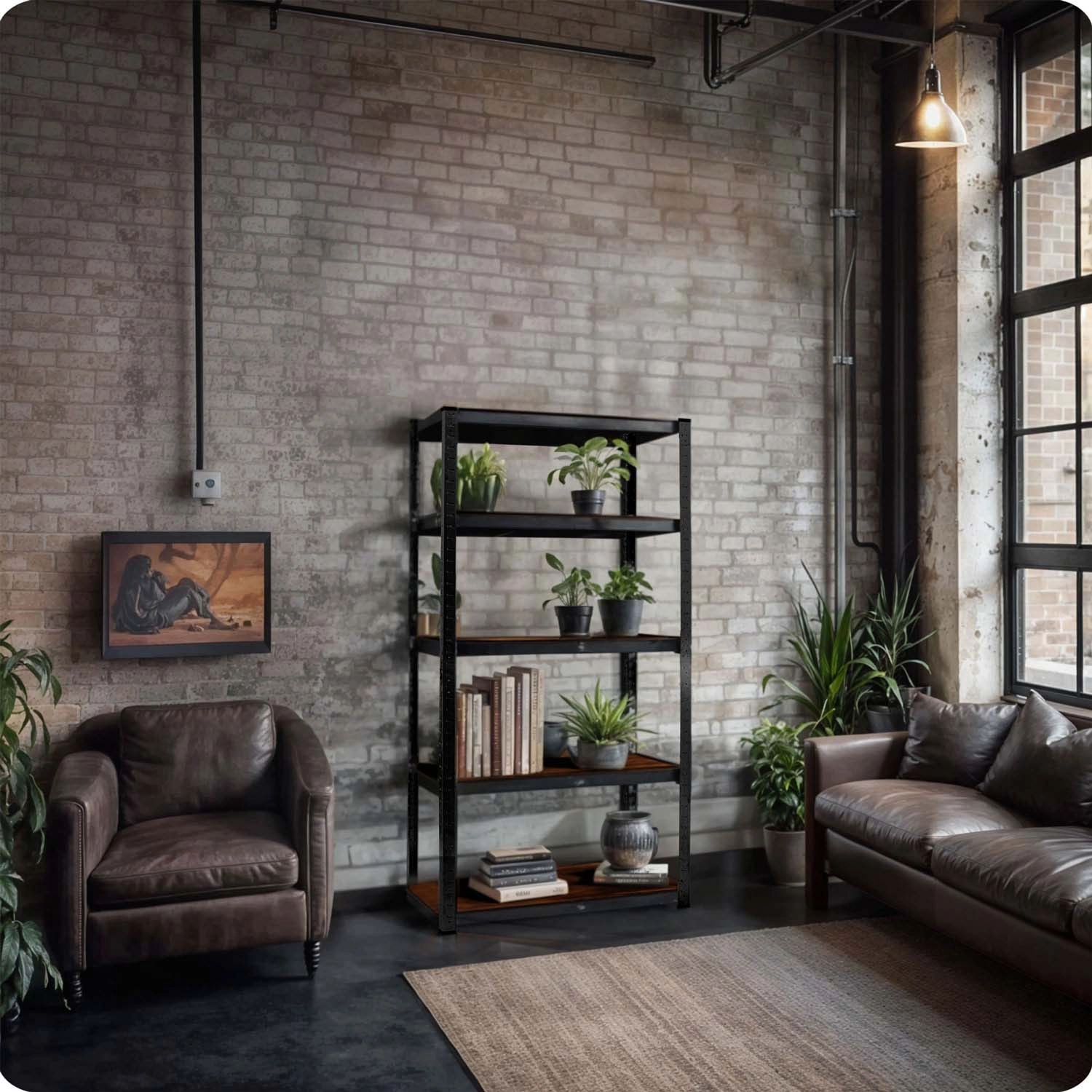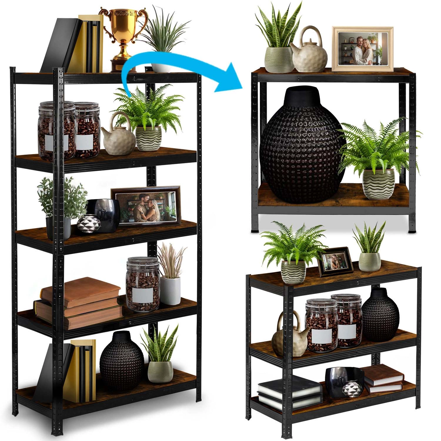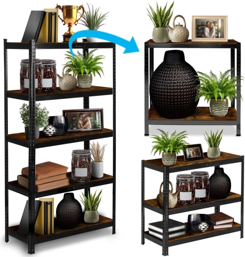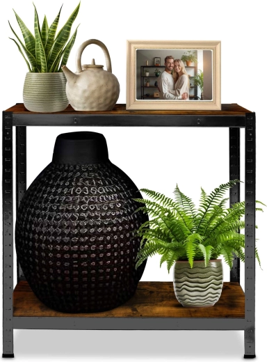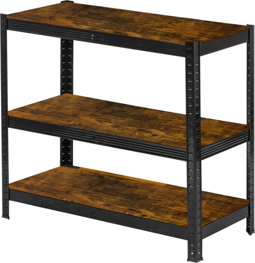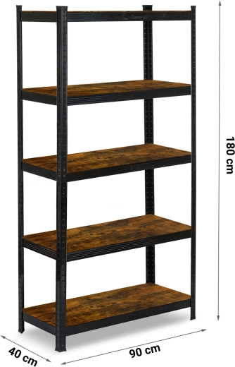 Galvanizált acél profilok fekete porszórt bevonattal és rusztikus MDF polcokkal, könnyen tisztítható, és jól illik garázsba, műhelybe vagy modern otthonokba.