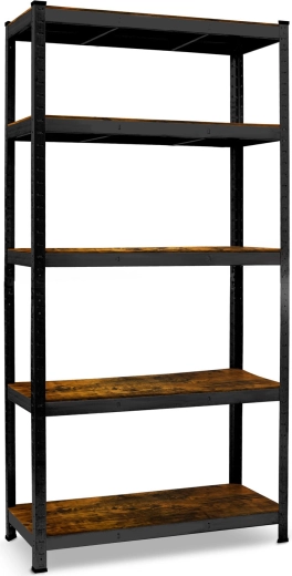 A tartós, fekete Humberg polc rusztikus fa hatású MDF polclapokkal ötvözi az ipari stílust a csúcsfunkcionalitással. A galvanizált acélprofilokból készült váz és a dupla középső merevítések nagyfokú stabilitást biztosítanak teljes terhelés mellett is. A polcok 40 mm-enként állíthatók, így a hely egyszerűen igazítható dobozokhoz, szerszámokhoz és irattári tárolókhoz.