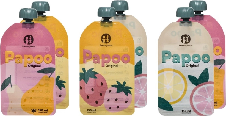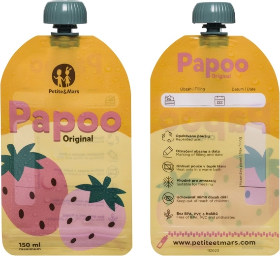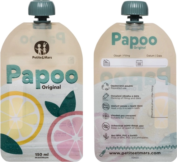A praktikus és környezetbarát PETITE&MARS Papoo Original tasakok 150 ml űrtartalommal ideálisak uzsonnához, pürékhez és joghurtokhoz utazáshoz. Többször használhatók, mosogatógépben moshatók, fagyaszthatók és könnyen feliratozhatók. BPA-, PVC- és ftalátmentesek, és úgy lettek tervezve, hogy a gyerekek rendetlenség nélkül, kényelmesen tudjanak enni belőlük.