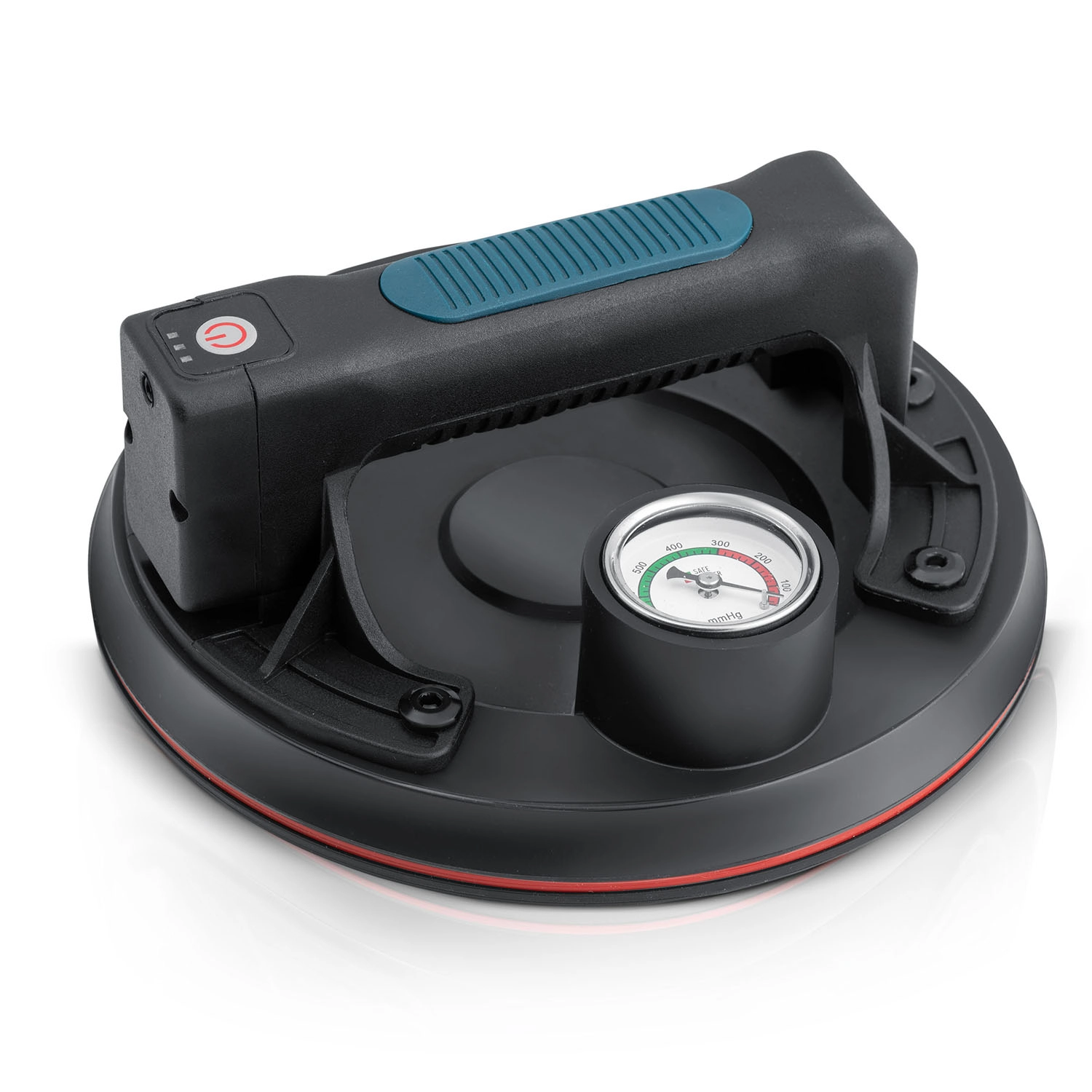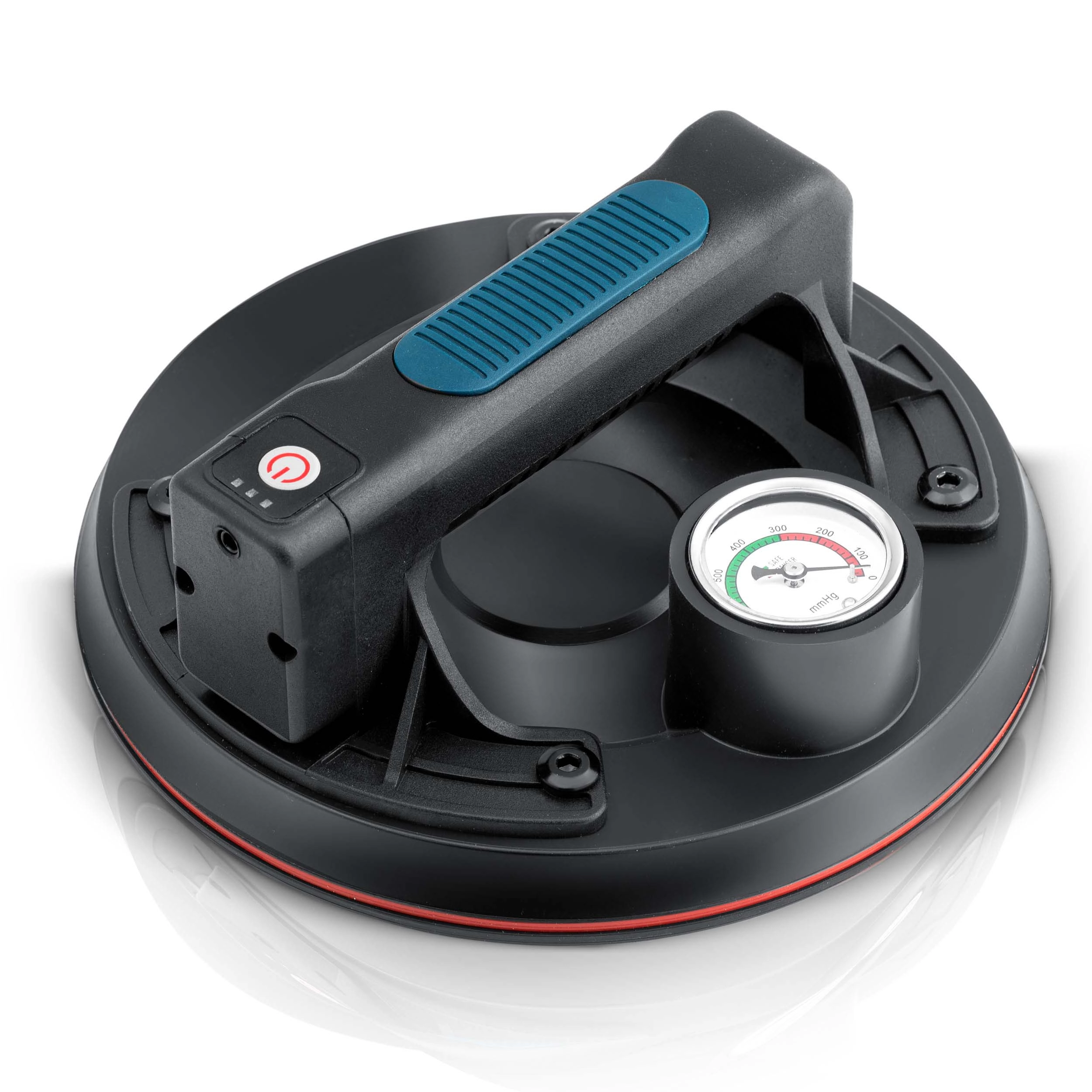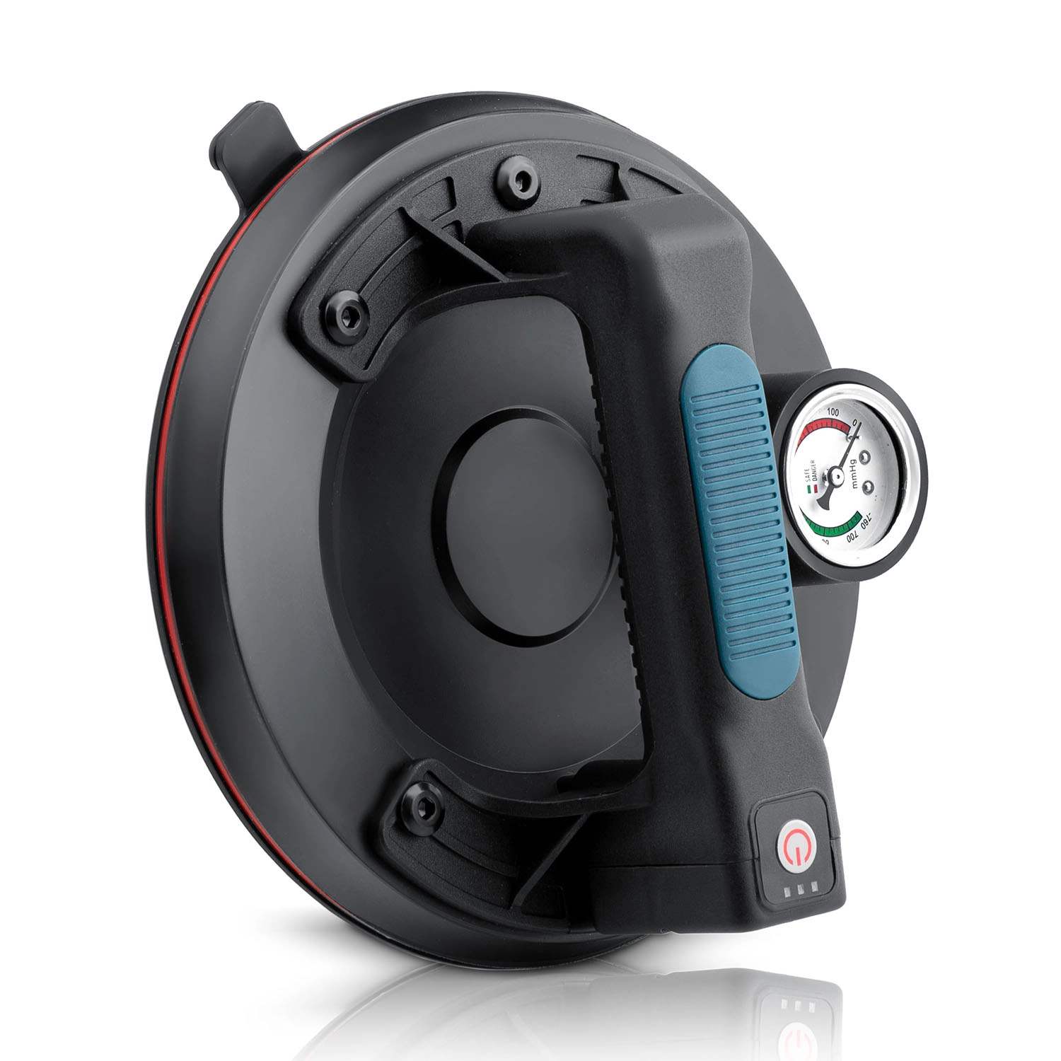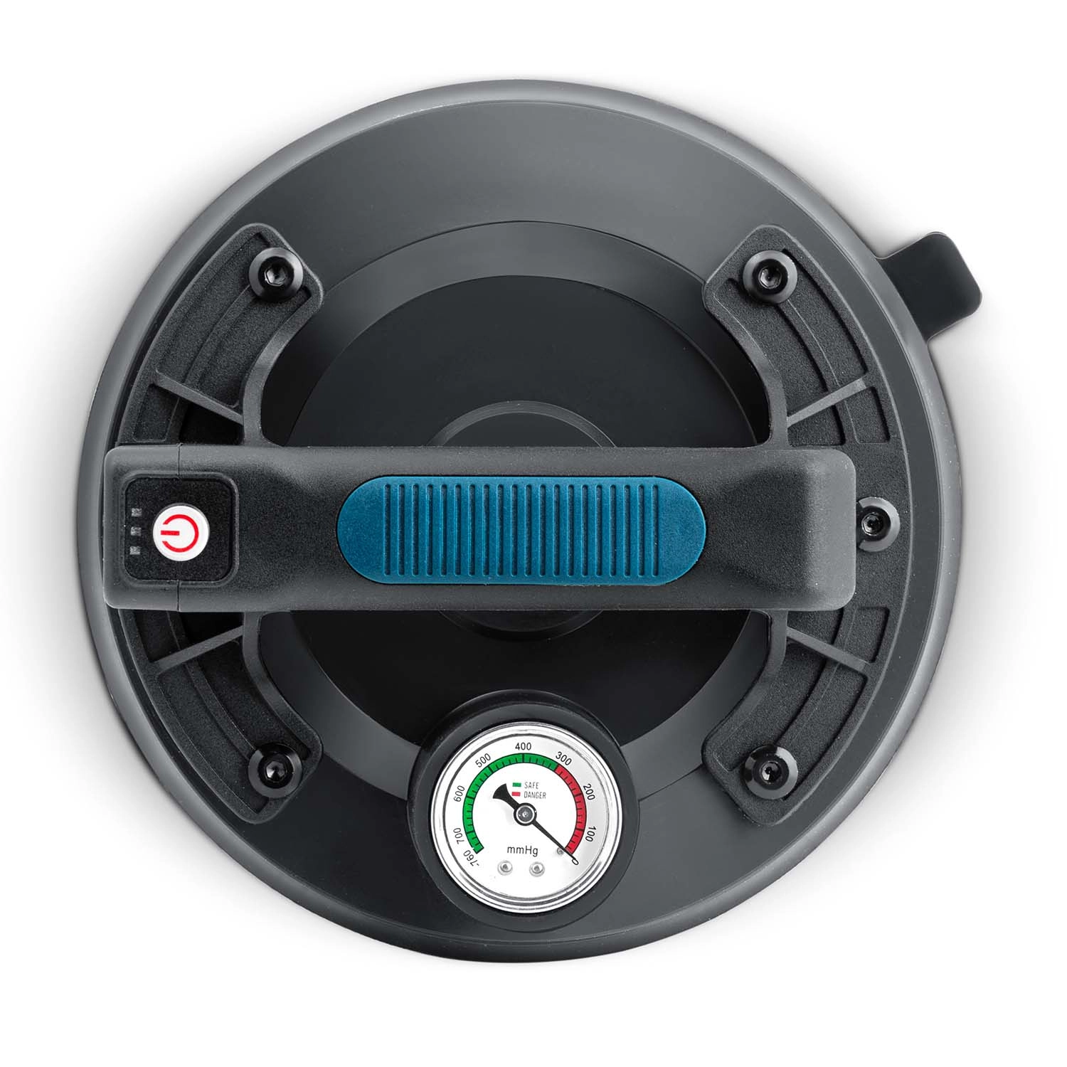 A színes skálájú manométer egyértelműen mutatja a vákuumszintet: 0–300 mmHg (alacsony, veszélyes) és 300–760 mmHg (optimális, biztonságos). A szívókorong emellett automatikusan pótolja a vákuumot csökkenés esetén.