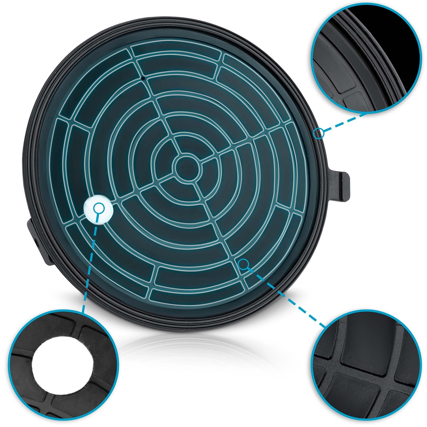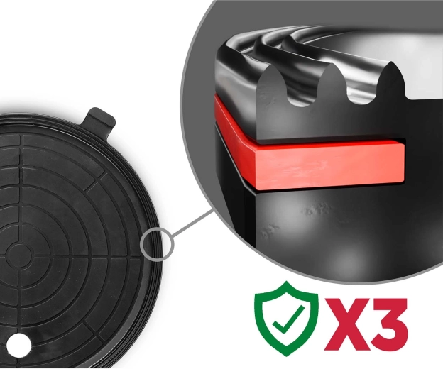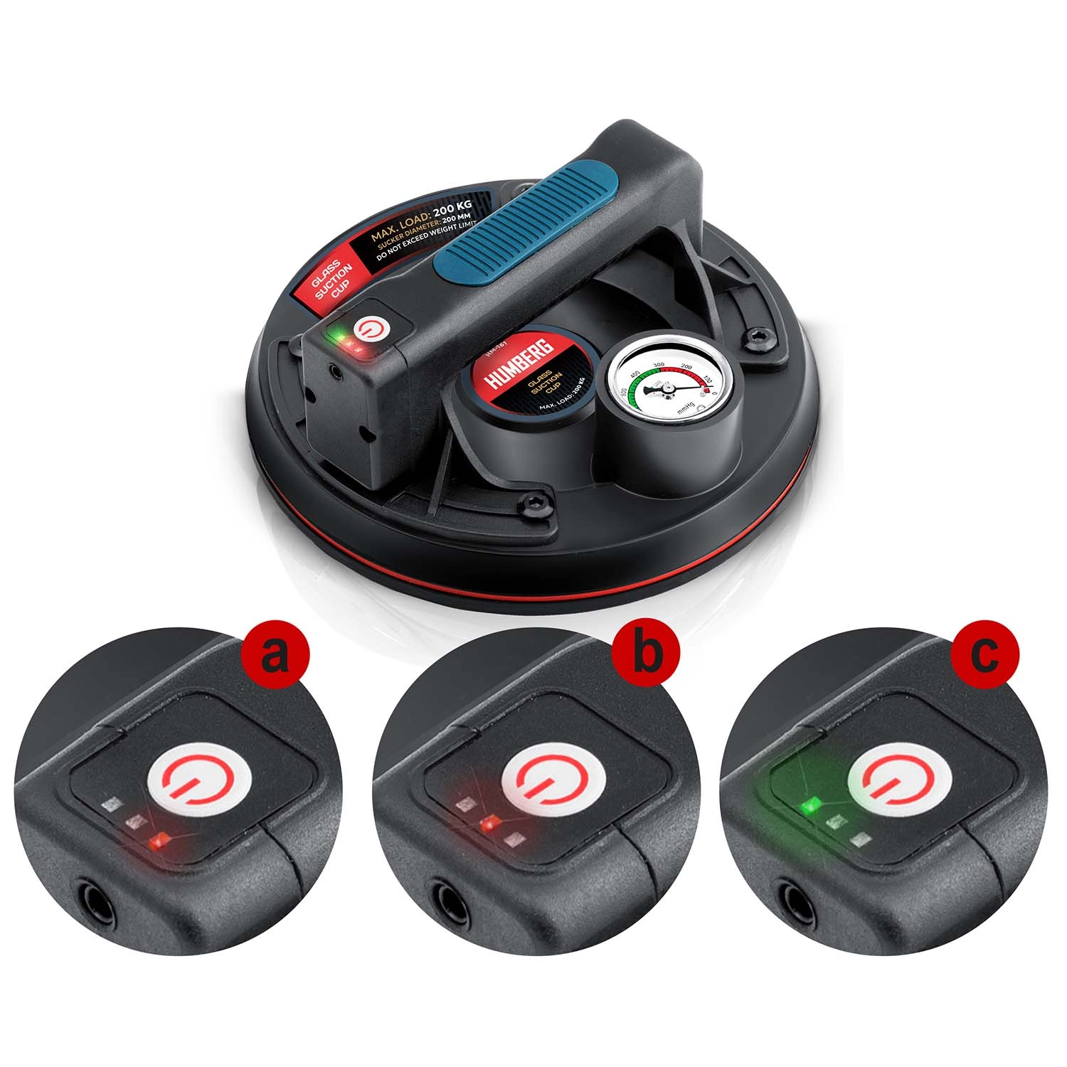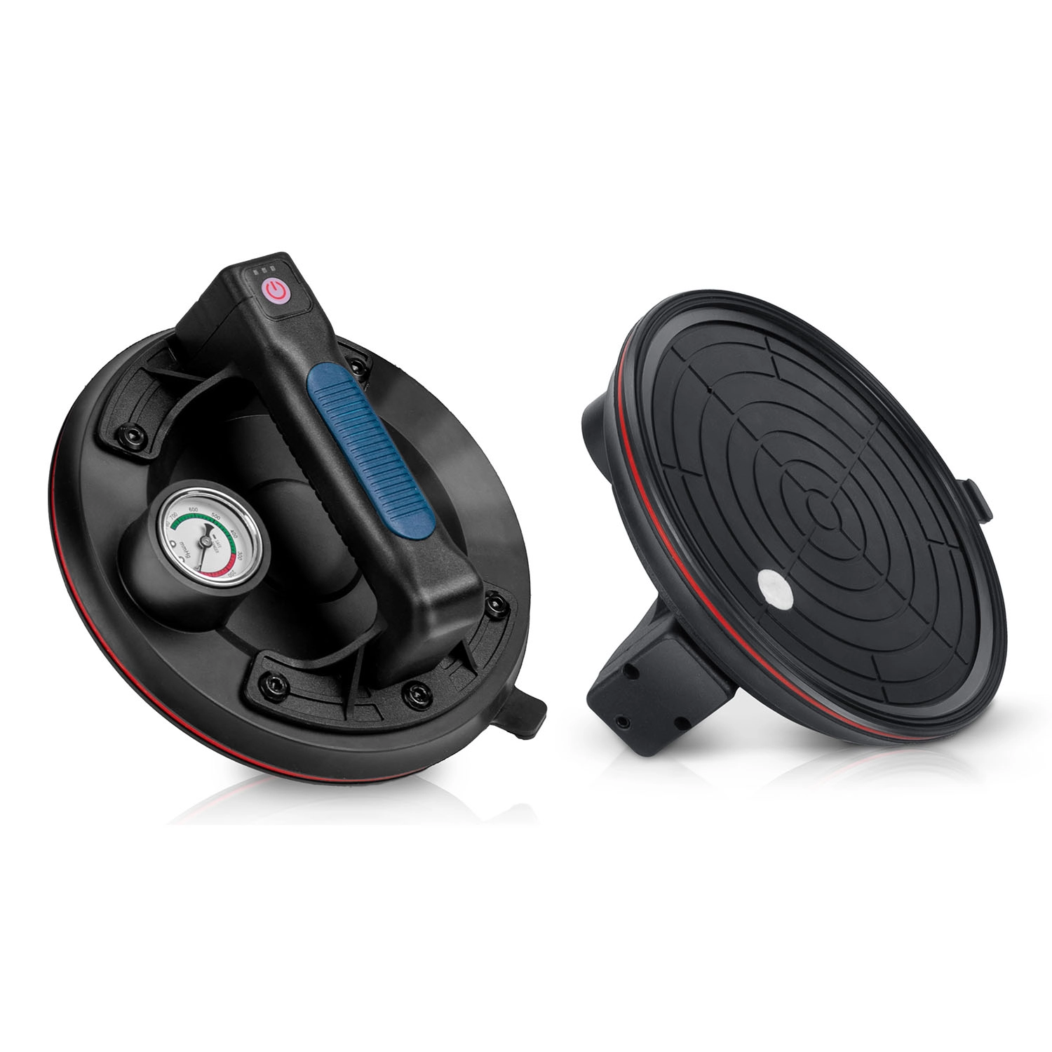 A színes skálájú manométer egyértelműen mutatja a vákuumszintet: 0–300 mmHg (alacsony, veszélyes) és 300–760 mmHg (optimális, biztonságos). A szívókorong emellett automatikusan pótolja a vákuumot csökkenés esetén.