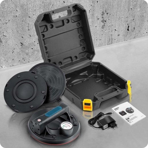 A beépített 2400 mAh Li-ion akkumulátor akár 8 óra folyamatos üzemet tesz lehetővé, a teljes feltöltés pedig mindössze 2 óra. A szívókorong praktikus koff erben érkezik, minden szükséges tartozékkal, professzionális szerelési és anyagmozgatási felhasználásra.