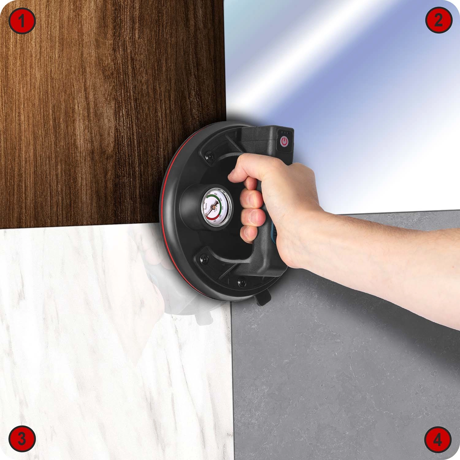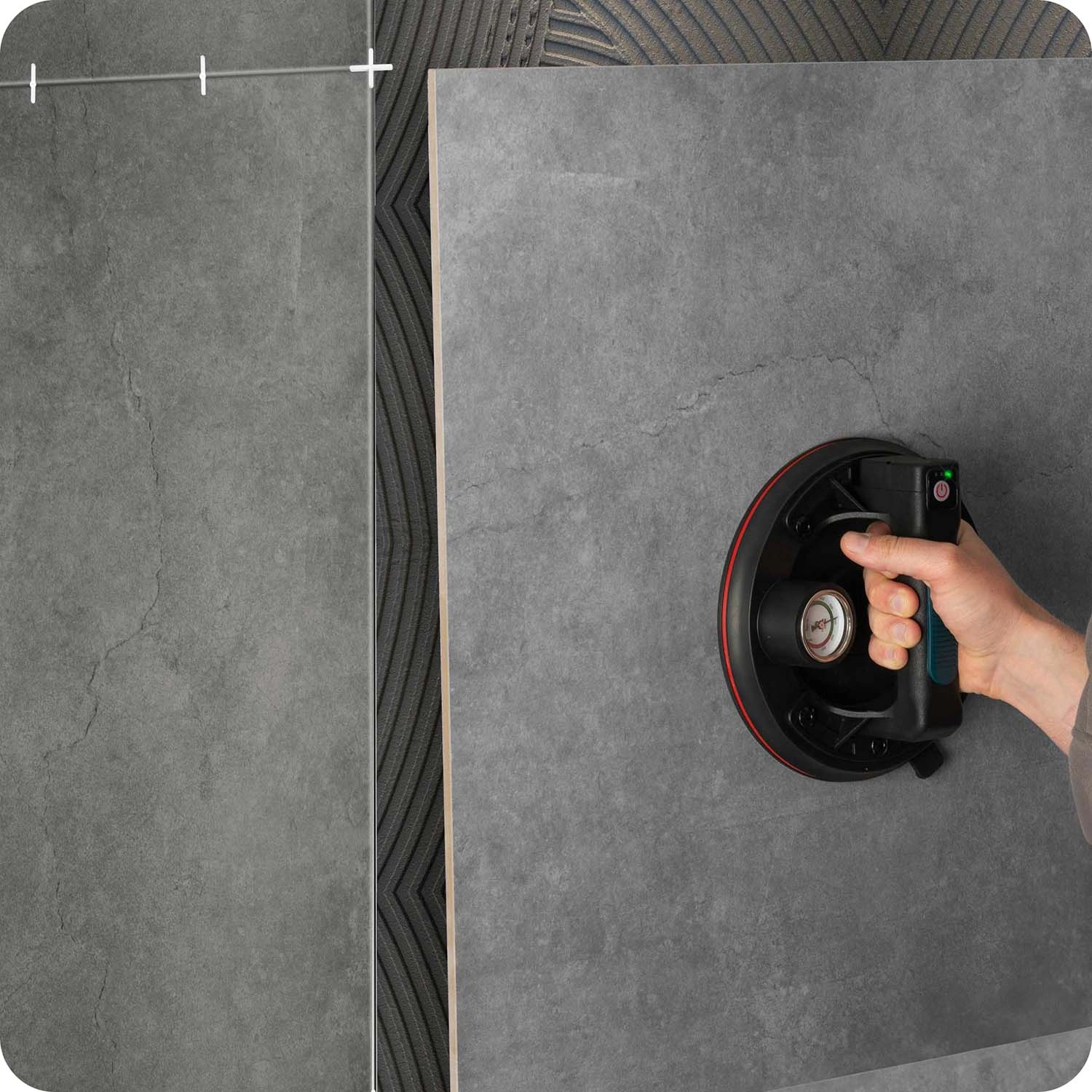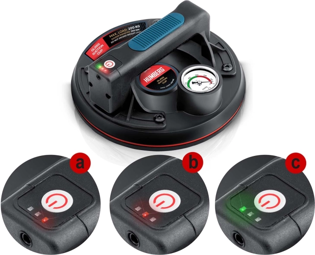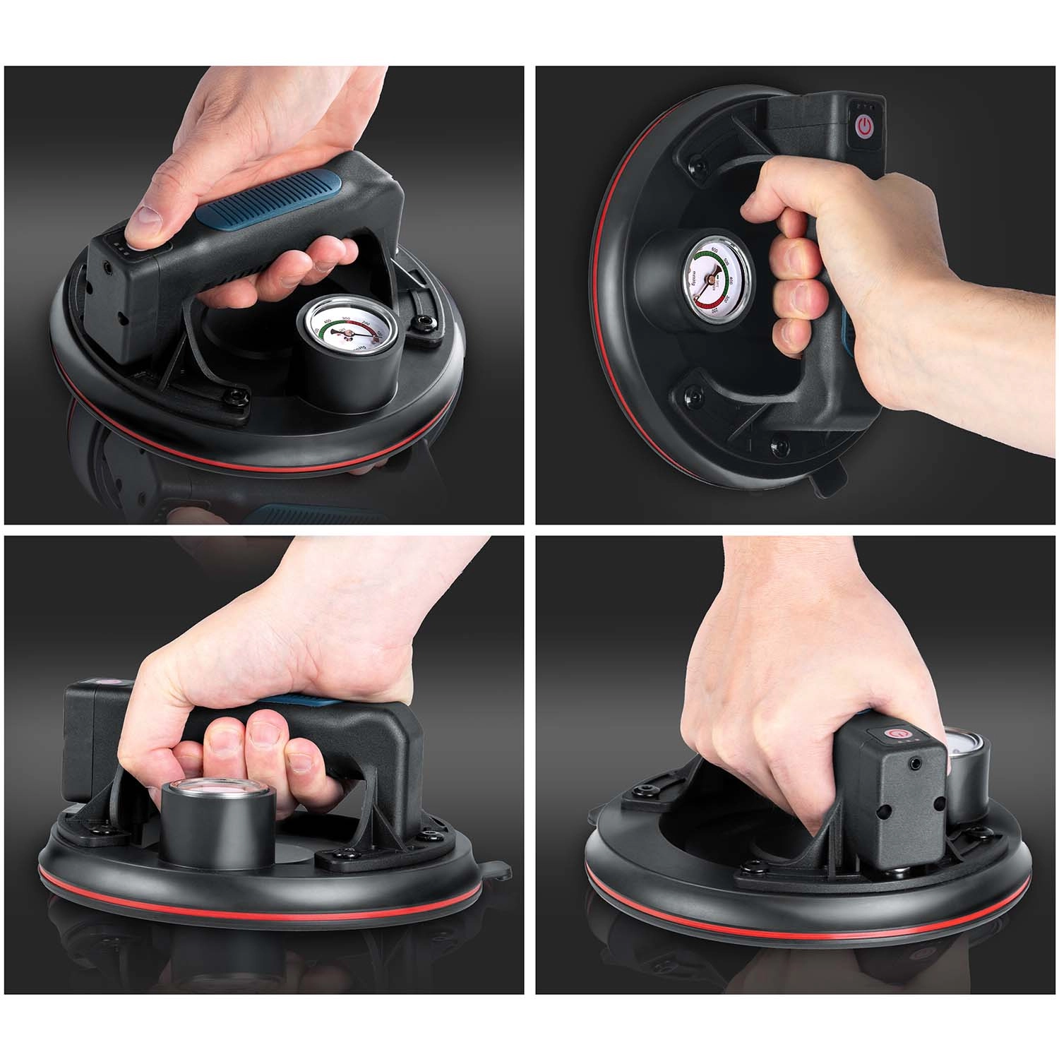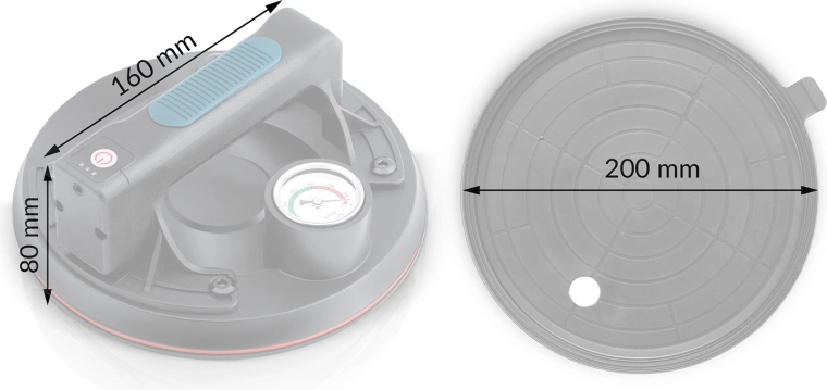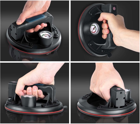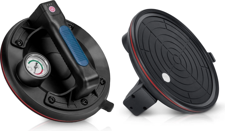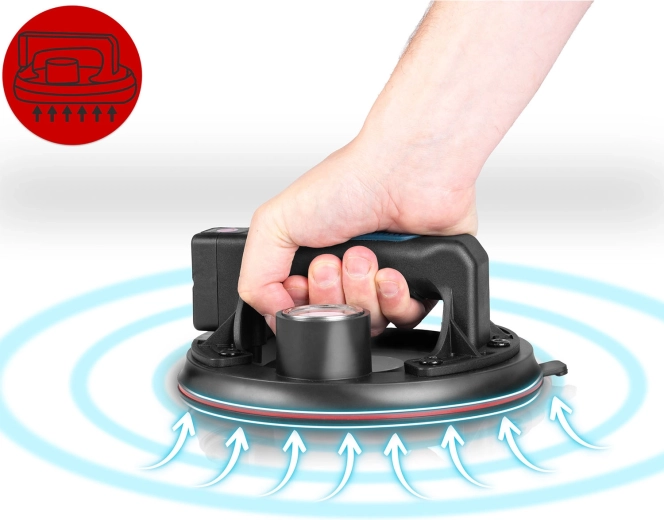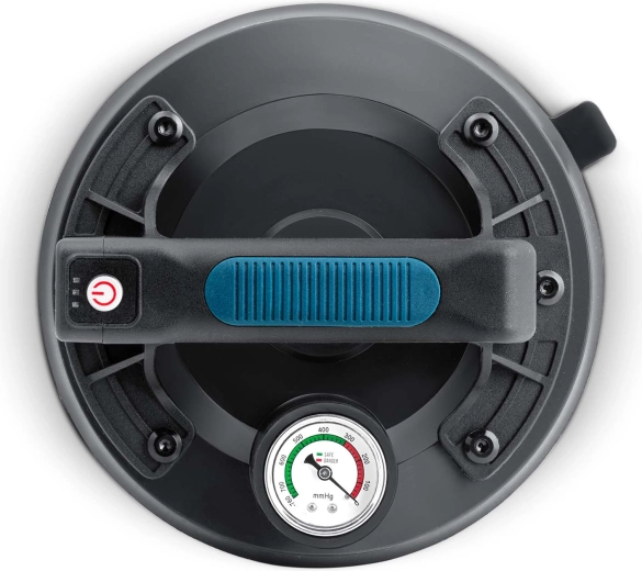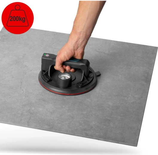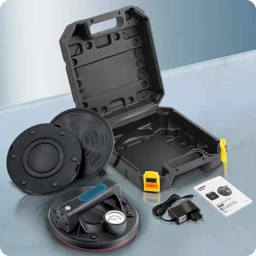 Ez a kompakt elektromos szívókorong a nehéz panelek, üveg, csempék vagy polírozott kő gyors és biztonságos mozgatására készült. A hármas gumitömítés kiváló tapadást, tömítettséget és rezgéscsillapítást biztosít, míg a színes skálájú manométer folyamatos ellenőrzést nyújt a vákuumszint felett (optimálisan 300–760 mmHg). Az ergonomikus, formázott markolat hosszabb munka során is növeli a kényelmet.