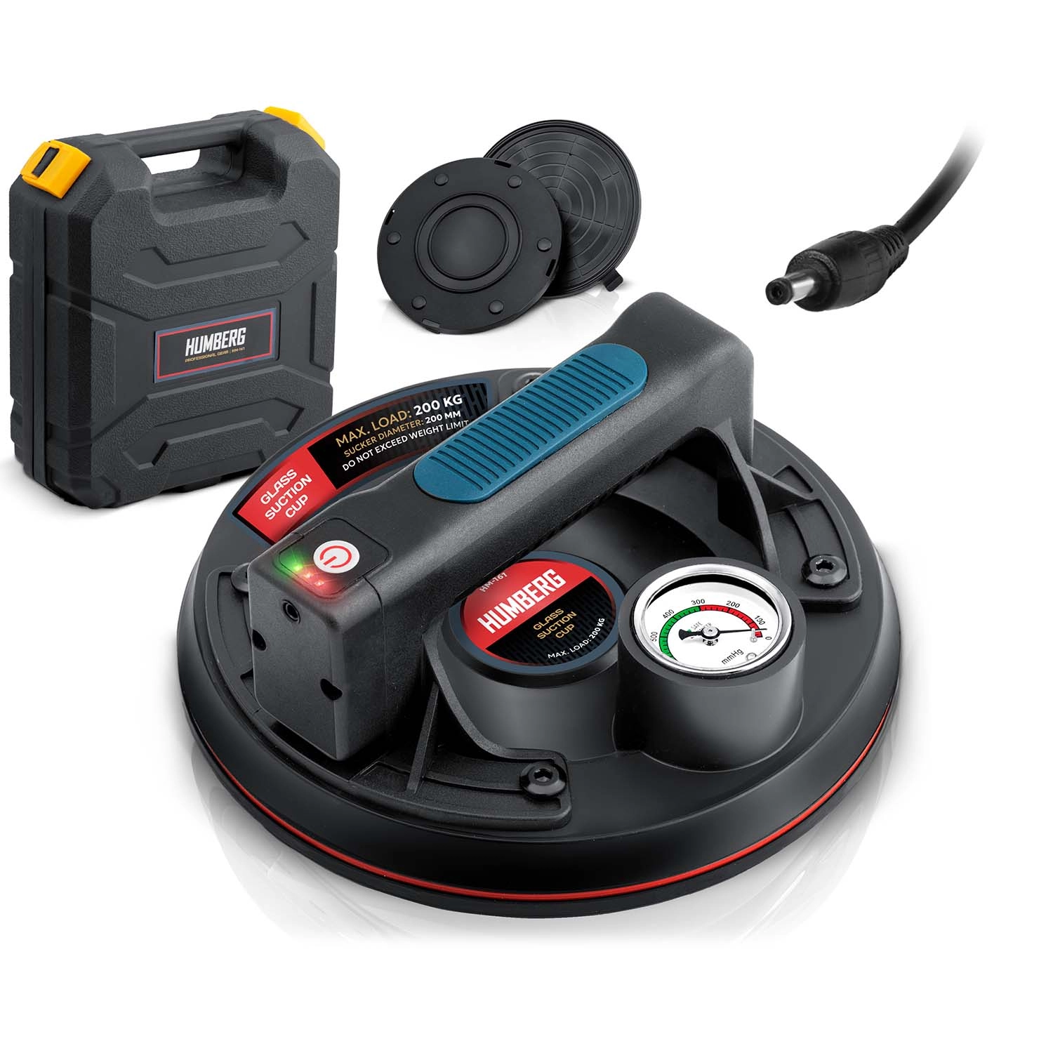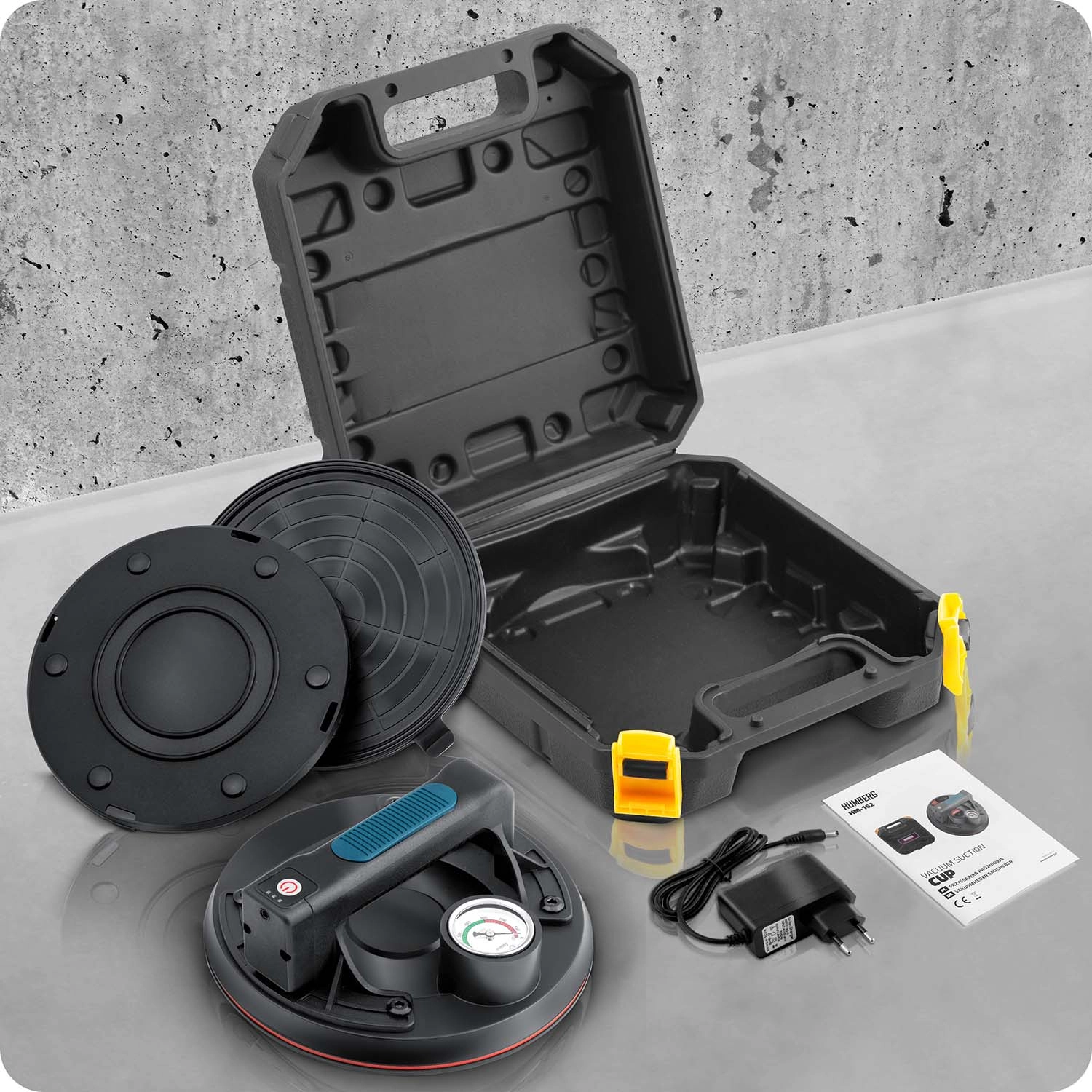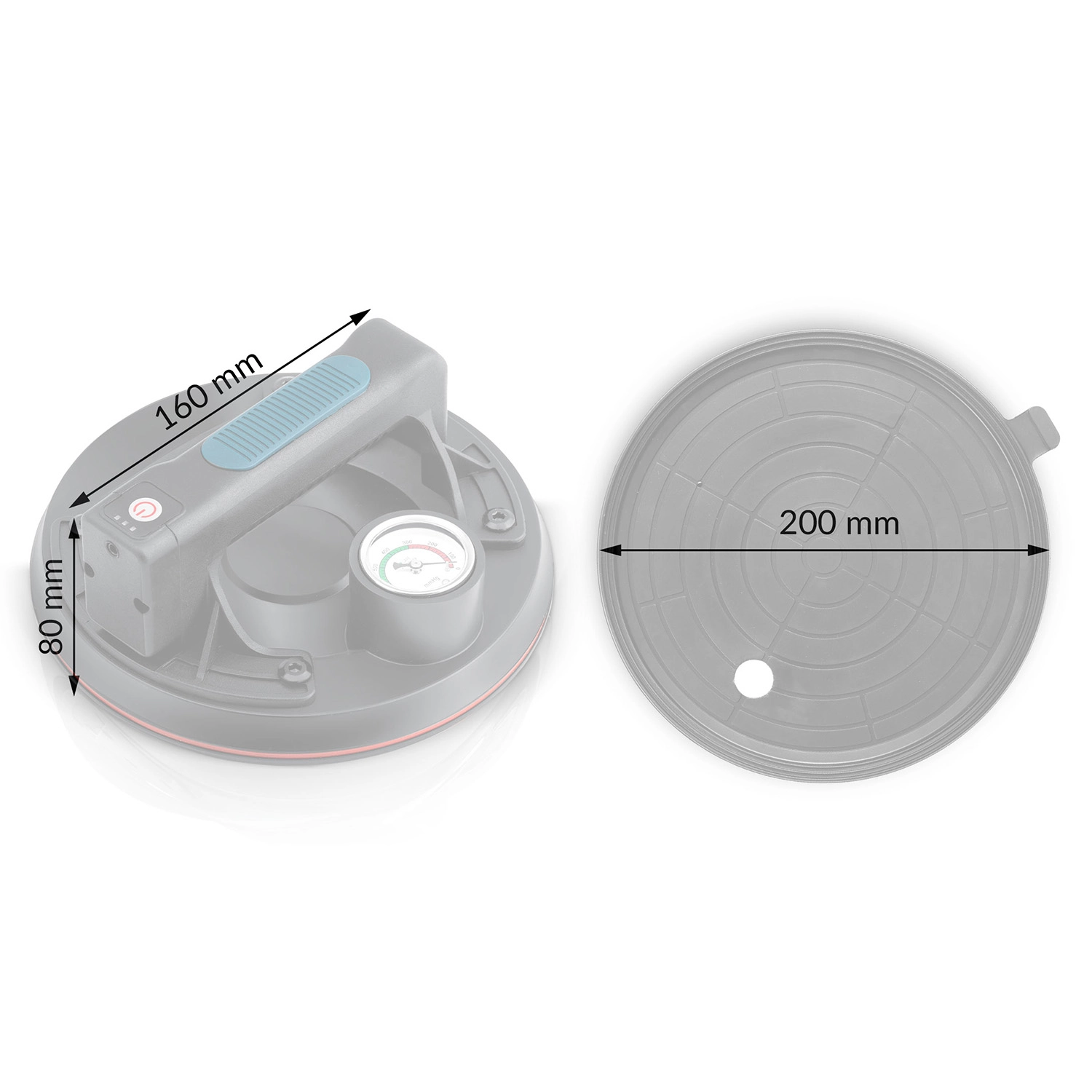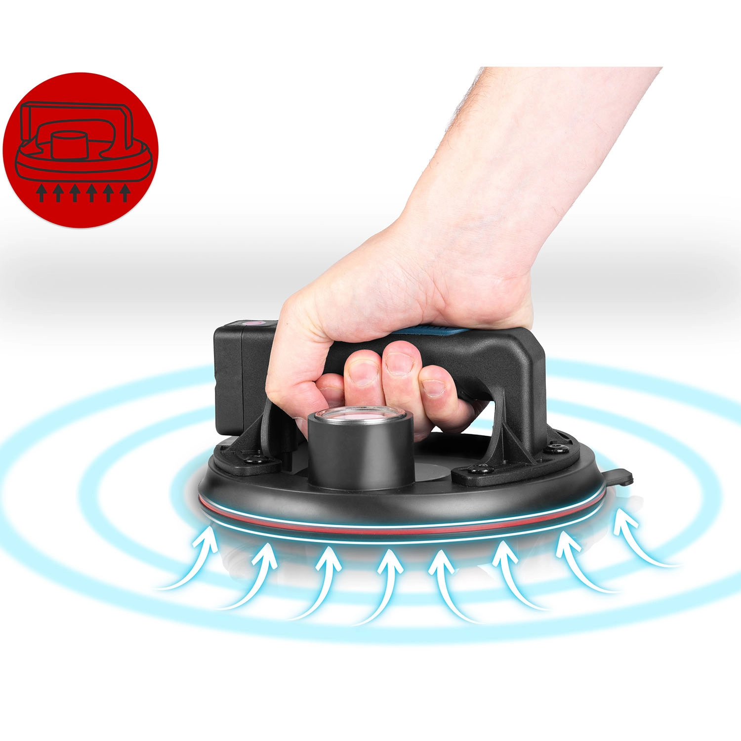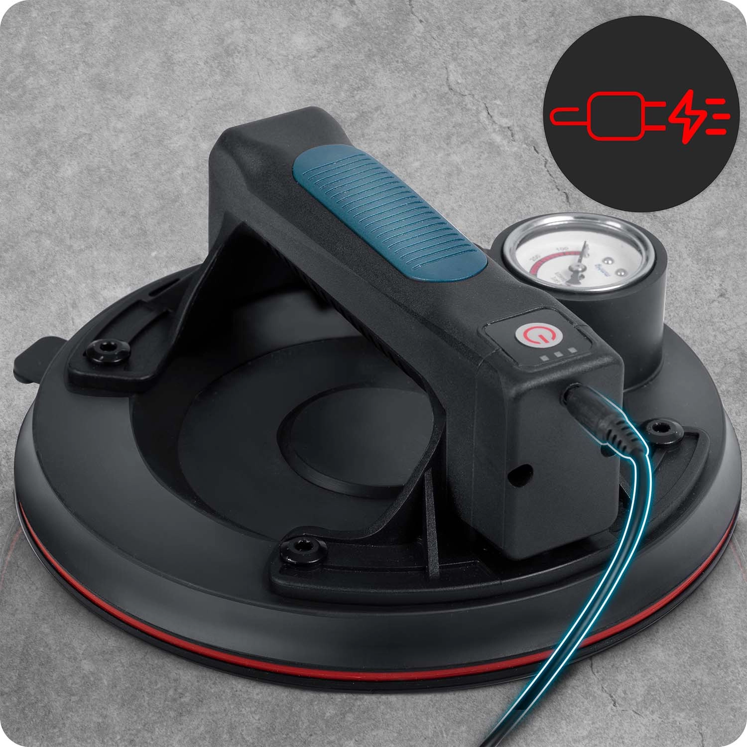 Ez a kompakt elektromos szívókorong a nehéz panelek, üveg, csempék vagy polírozott kő gyors és biztonságos mozgatására készült. A hármas gumitömítés kiváló tapadást, tömítettséget és rezgéscsillapítást biztosít, míg a színes skálájú manométer folyamatos ellenőrzést nyújt a vákuumszint felett (optimálisan 300–760 mmHg). Az ergonomikus, formázott markolat hosszabb munka során is növeli a kényelmet.