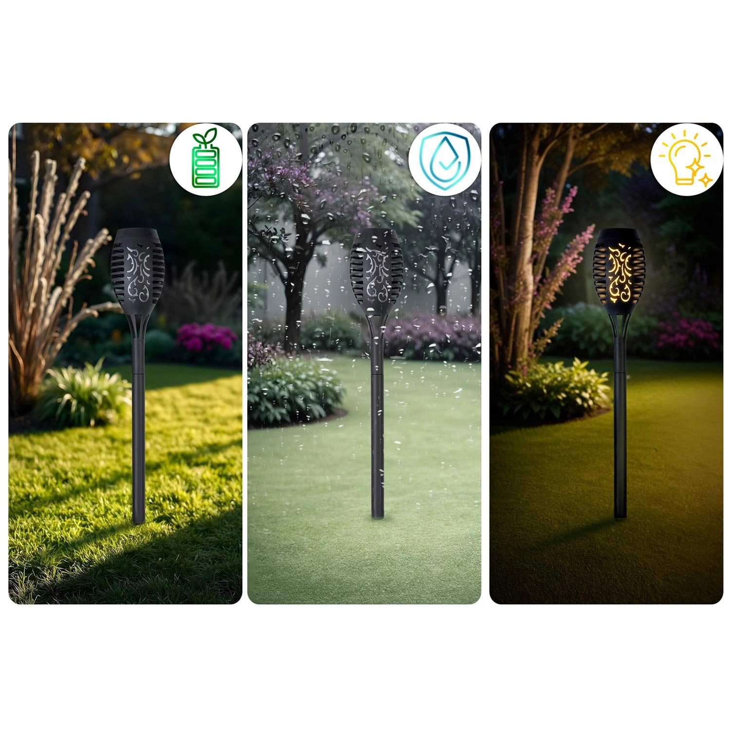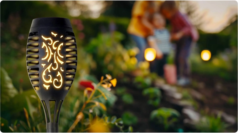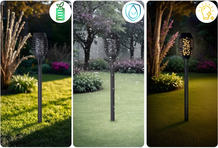 Varázslatos hangulatot teremthet a kertben a két darabos napelemes fáklyalámpa szettel. A rusztikus dizájn és a meleg, lánghatású fény ideális a sétányok és ágyások megvilágításához. Az amorf napelem gyenge fényben is tölti az akkumulátort, az éjszakai automatikus felkapcsolás és az IPX4 vízállóság gondtalan használatot biztosít.