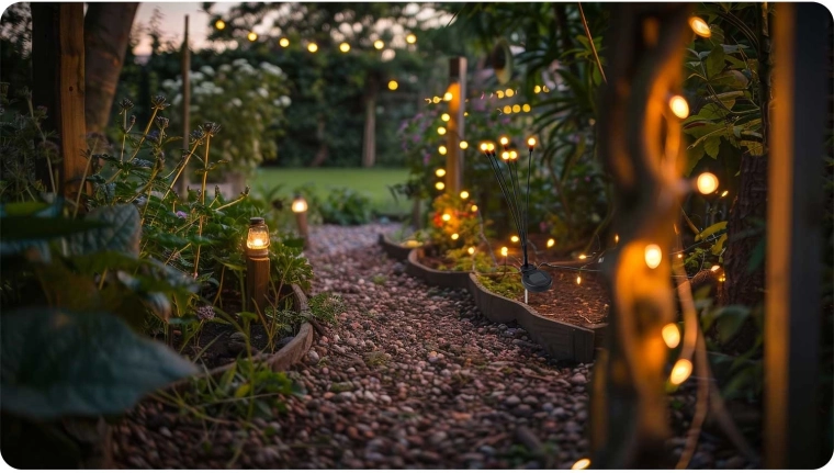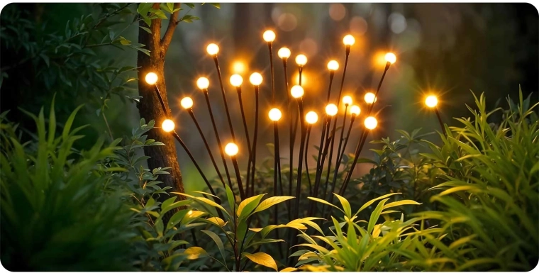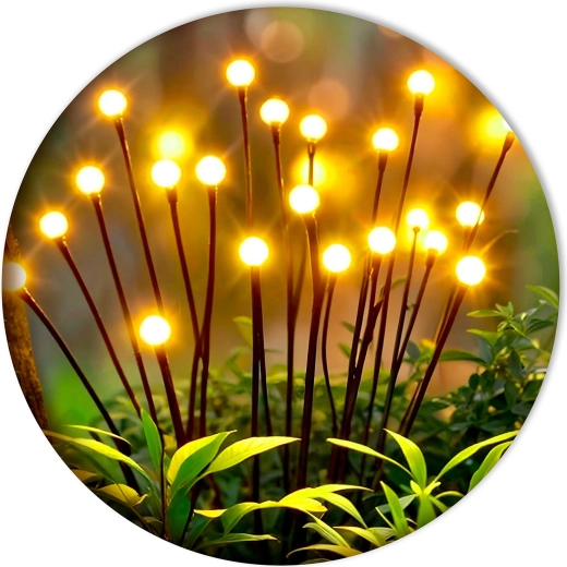 Több hajlékony szár meleg fényű LED golyókkal finom szikrázást kelt a növények között és az ösvények mentén – természetes, dekoratív és nagyon látványos.