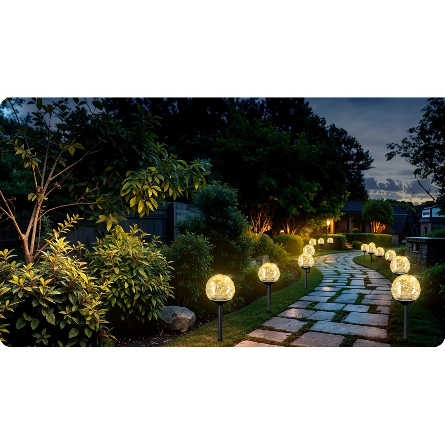 Az átlátszó gömbök meleg fényű LED pontjai szépen szórják a fényt, kiemelve a járdák és ágyások íveit. Ideális a tájékozódáshoz és a kellemes hangulathoz alkonyatkor.