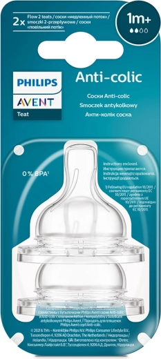 A kiváló minőségű Philips AVENT szilikon cumik Anti-colic technológiával lassú átfolyást biztosítanak 1 hónapos kortól. A szabadalmazott egyirányú szelep segít csökkenteni a kólikát és a puffadást azáltal, hogy levegőt enged a cumisüvegbe, megakadályozva a vákuum kialakulását. A puha és vékony szilikon, meghosszabbított bordázattal, formastabilitást biztosít, a széles kialakítás pedig támogatja a természetes ráharapást, megkönnyítve a szoptatás és az üveges etetés kombinálását.