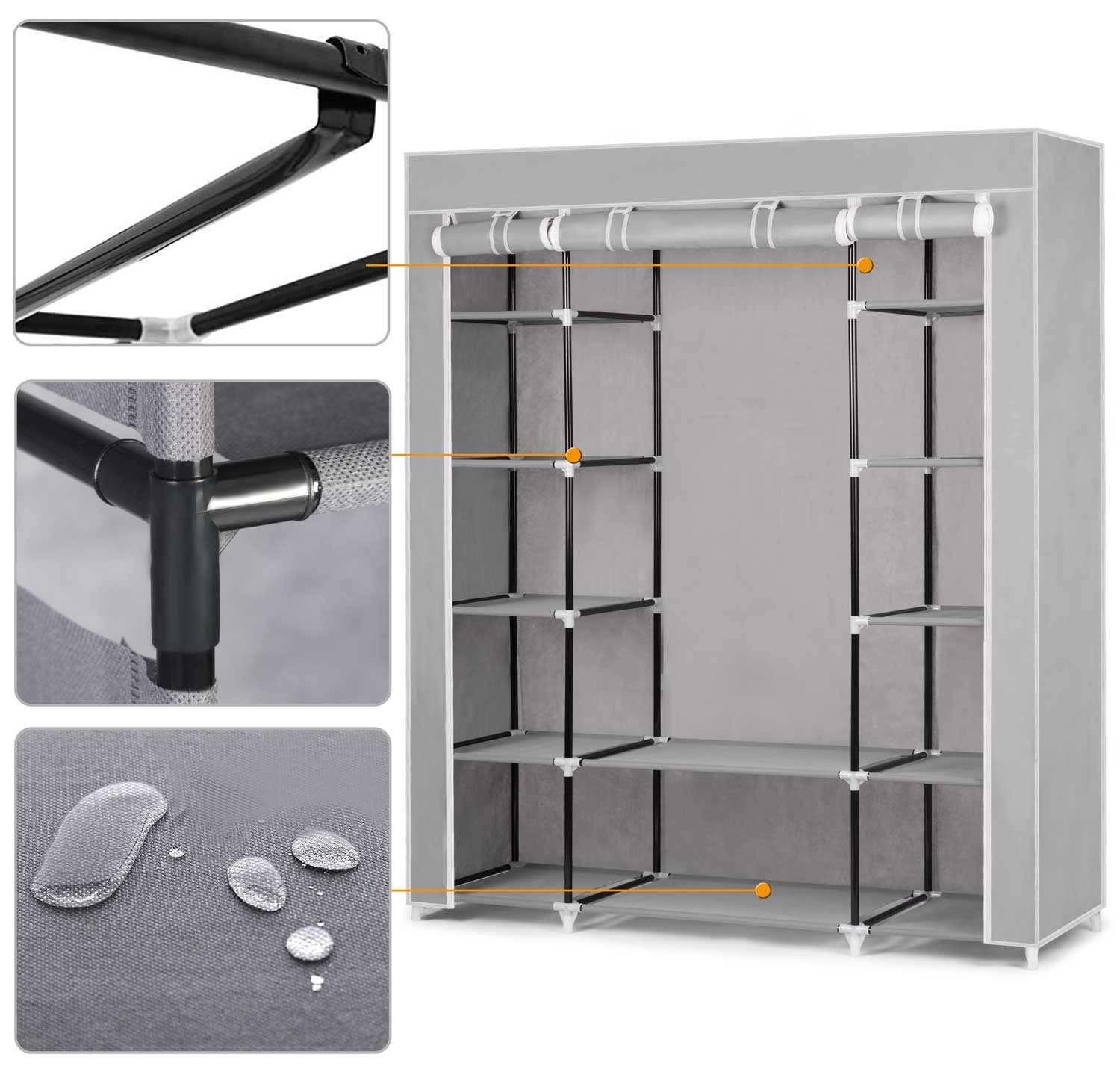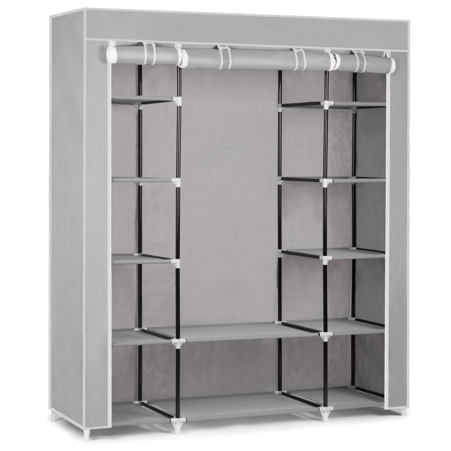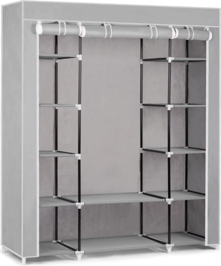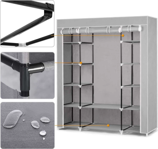 A Massido textilszekrény – szürke ideális megoldás hálószobákba, gardróbokba, előszobákba és diákszobákba. A strapabíró acél váz erős PP csatlakozókkal és a vízálló huzat hosszú élettartamot biztosít a mindennapos használat mellett is. Az átgondolt polckiosztásnak és a ruharúdnak köszönhetően könnyedén elrendezheti ruháit, kiegészítőit és lábbelijeit.