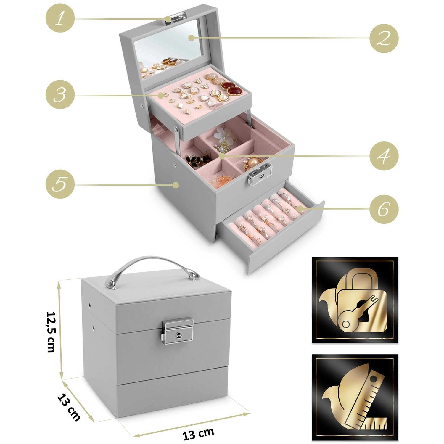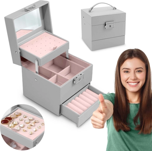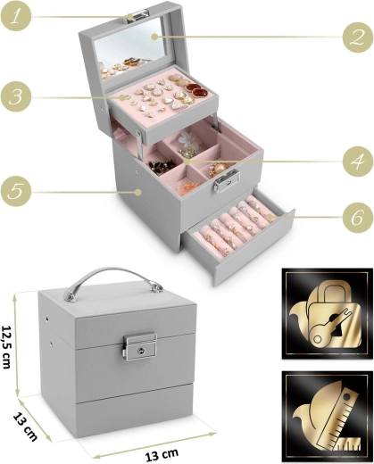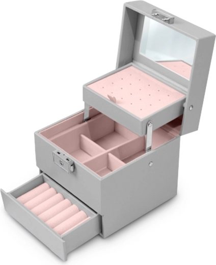 Az elegáns, szürke Massido ékszerdoboz kompakt méretekkel, áttekinthető ékszerrendezéssel és kulcsos biztonsági zárral rendelkezik. Belül tükröt, fülbevalótartó panelt, kivehető rekeszeket és gyűrűtartó fiókot talál. A tartós PU ökobőr bársonyosan rózsaszín belsővel óvja az ékszereket, a fogantyúnak köszönhetően pedig utazáshoz is ideális.