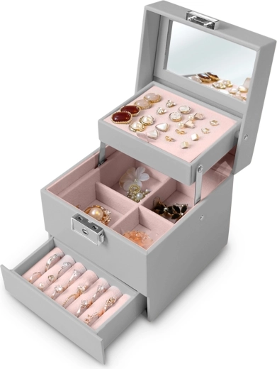 Stílusos és funkcionális ékszerdoboz modern szürke színben, amely a prémium anyagokat okos belső tagolással ötvözi. A fedélben lévő tükör, a kivehető fülbevalópanel, a láncoknak és karkötőknek kialakított rekeszek, valamint a hengerekkel ellátott külön gyűrűfiók minden kollekciót tökéletesen rendszerezve tart.