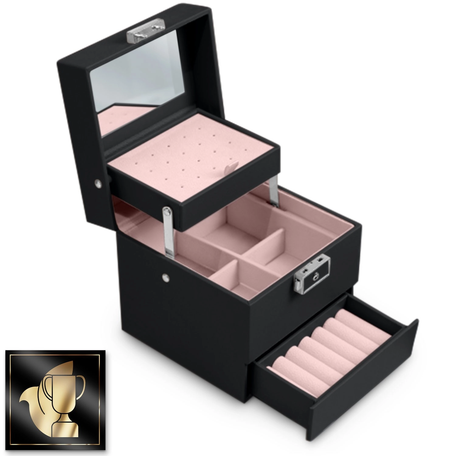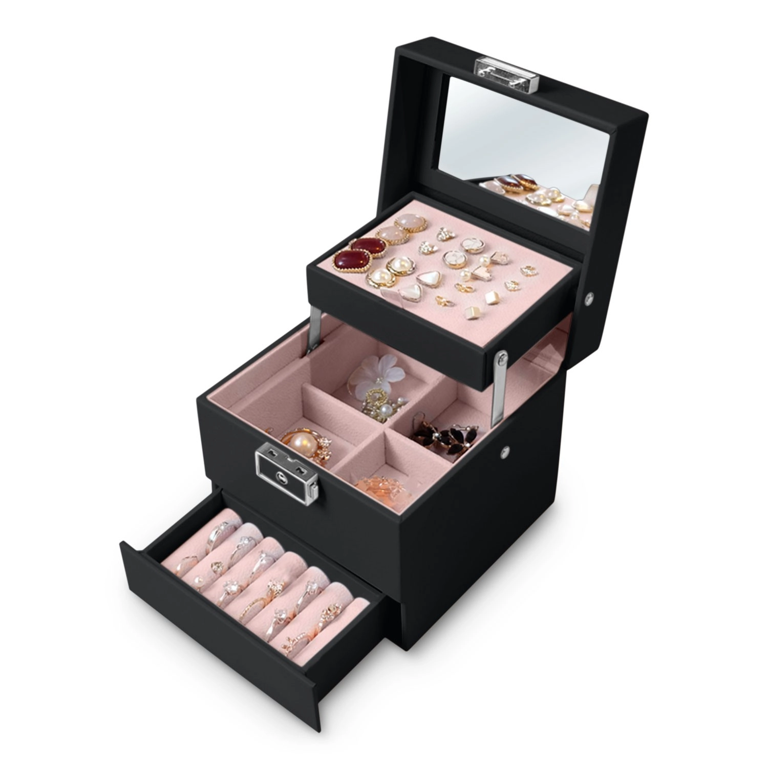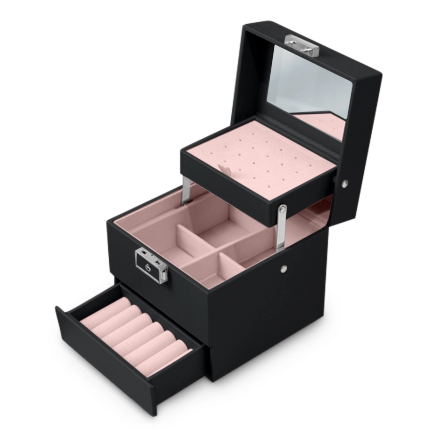 Párnázott sorok a gyűrűknek, perforált betét a fülbevalóknak és osztott rekeszek tartják az ékszereket áttekinthetően elkülönítve és védetten.