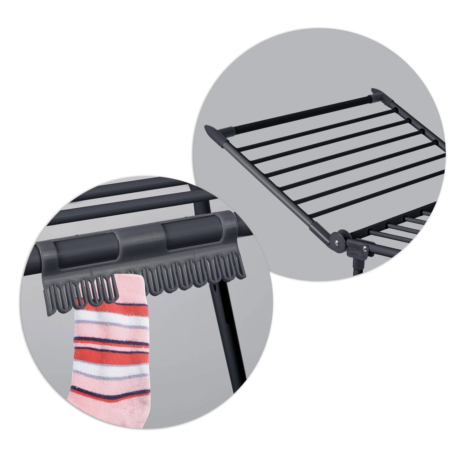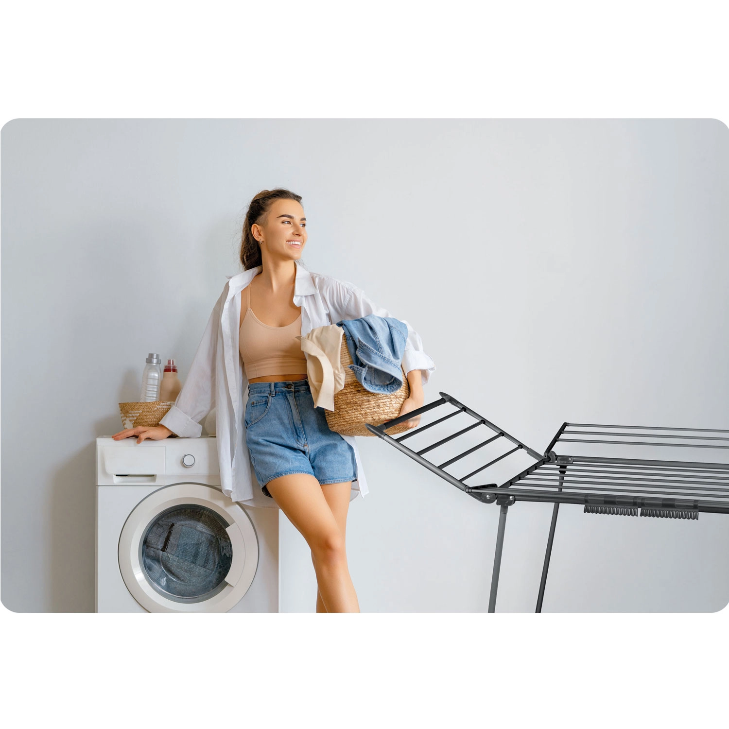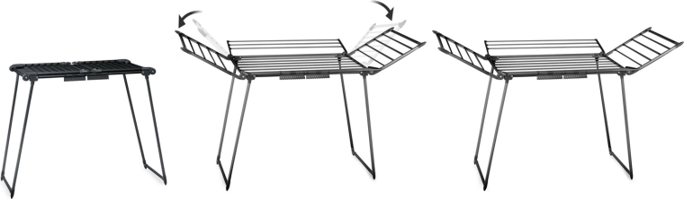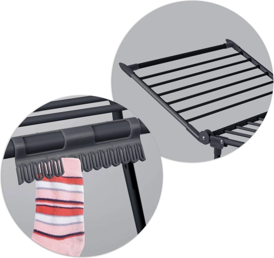 A vastagabb rudak eloszlatják a ruha súlyát és segítenek csökkenteni a gyűrődések kialakulását, így gyakran nem is kell vasalni. Az átgondolt rúdtávolság támogatja a gyors légáramlást a egyenletes és gyors száradásért. A praktikus akasztók a kisebb darabokhoz helyet szabadítanak fel a fő rudakon, a 4 összecsukható szárny pedig könnyen igazítható a ruhák hosszához és típusához.