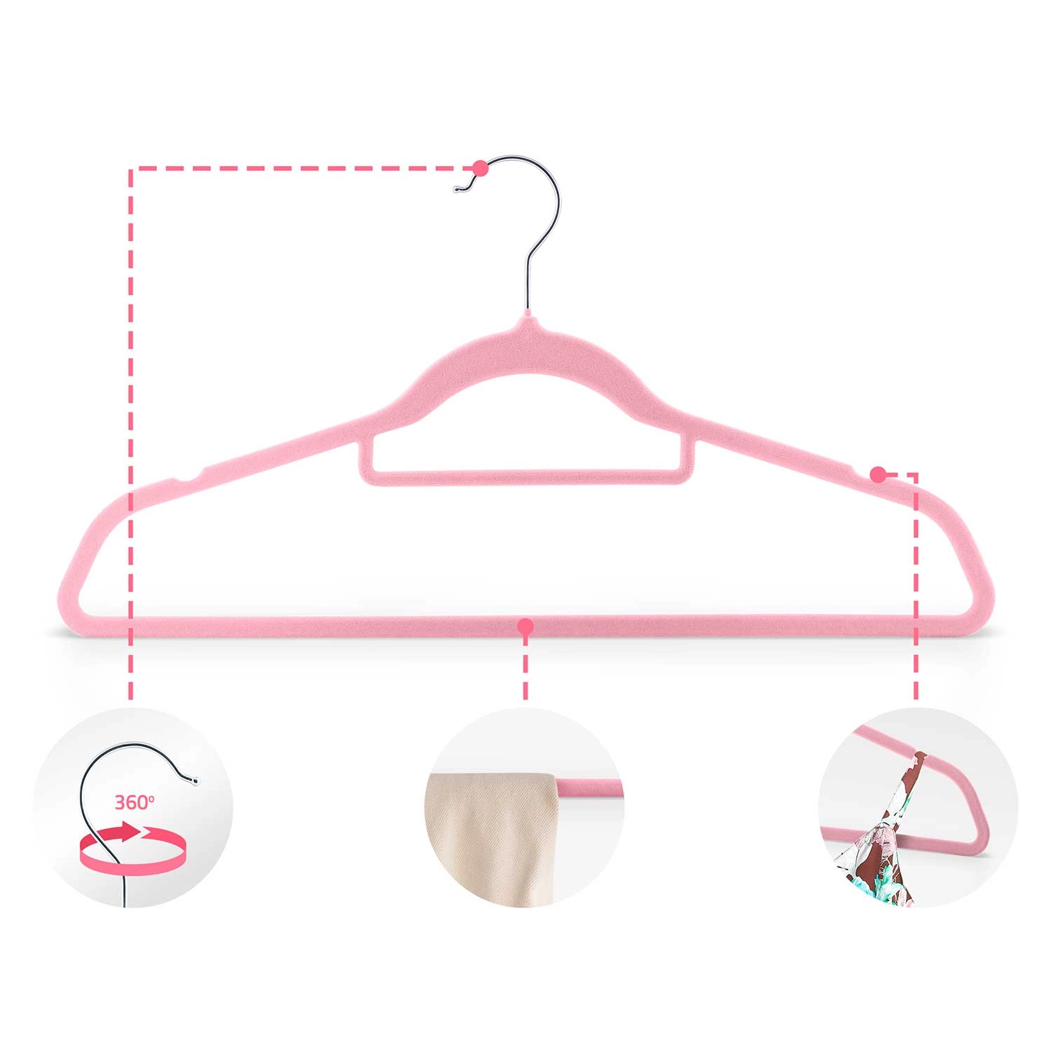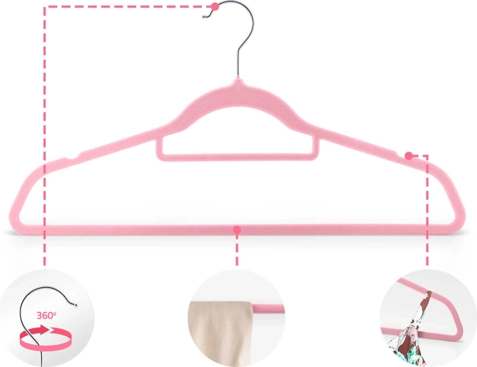 A 360°-ban forgatható kampó kényelmes akasztást és rendszerezést biztosít. A vállrészen lévő bevágások rögzítik a pántokat, az alsó rúd pedig bővíti a felhasználást nadrágokhoz vagy sálakhoz.