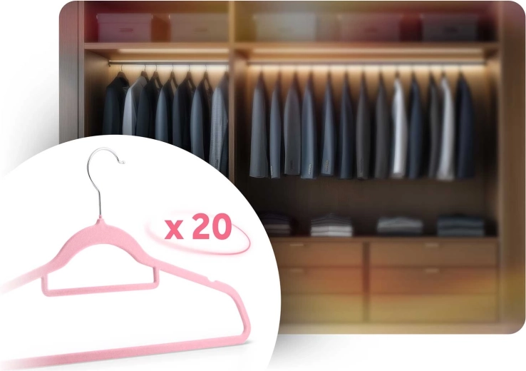 Ez a stílusos és praktikus, 20 darabos vállfakészlet gyorsan rendet teremt a szekrényben. A csúszásgátló velúr megakadályozza a finom anyagok lecsúszását, míg az átgondolt forma vállrészi bevágásokkal a vékony pántos felsőket is a helyükön tartja. A forgatható acélkampó kényelmessé teszi a válogatást és az akasztást felesleges erőfeszítés nélkül.