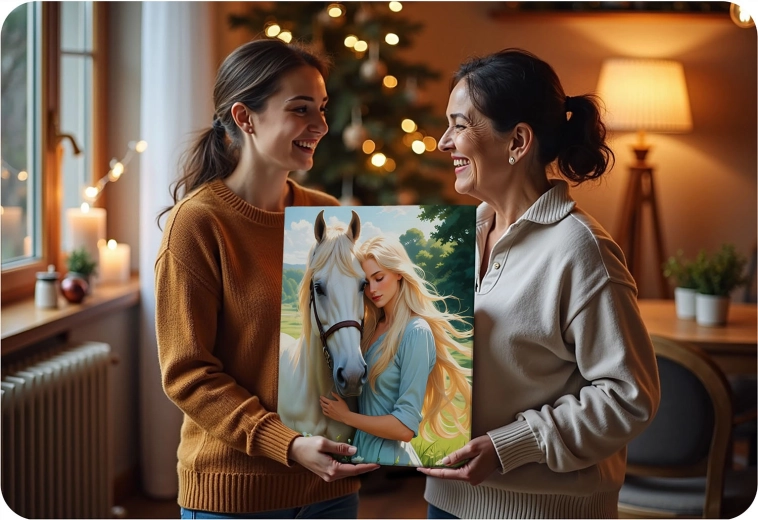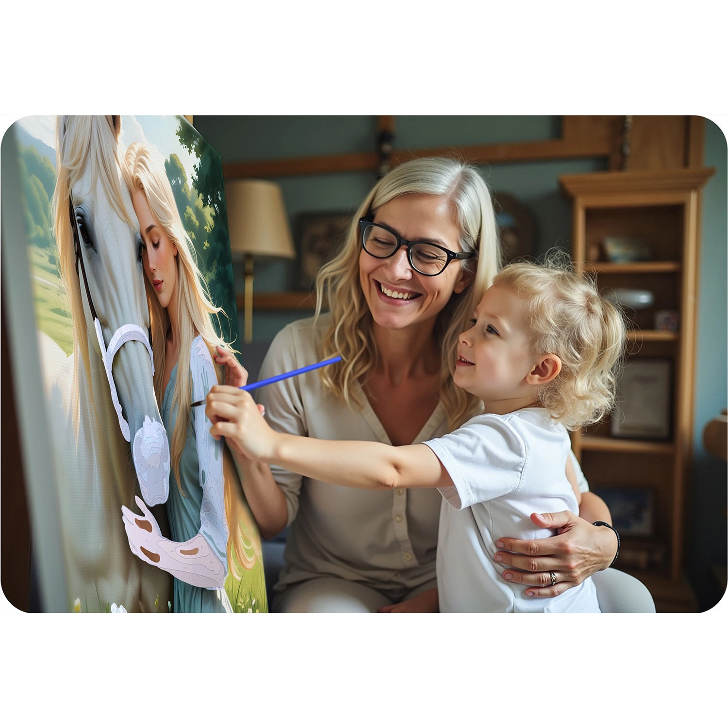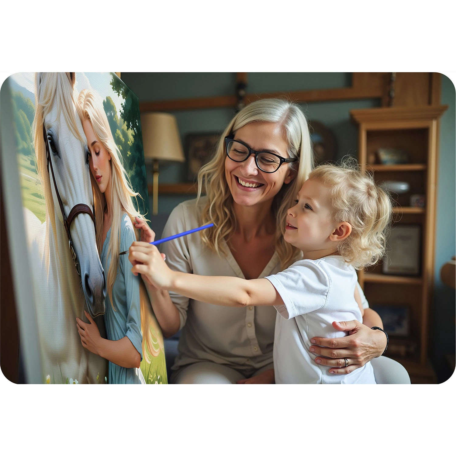 A nő fehér lóval ábrázolt portréja telt árnyalatokkal és magas részletességgel tűnik ki. A kész művelet otthona figyelemfelkeltő dekorációja lesz.
