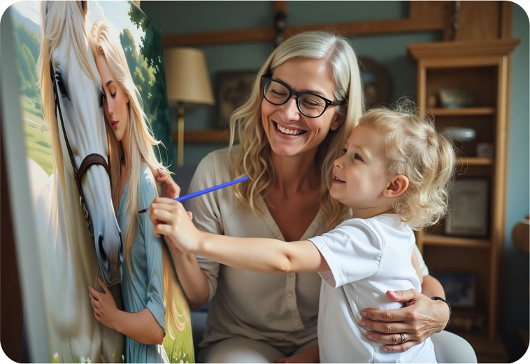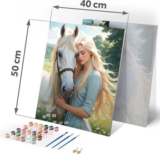 A csomagban 3 különböző méretű ecset található nagy felületekhez, részletekhez és finom vonalakhoz. 30 árnyalatnyi akrilfesték jó fedőképességgel biztosítja a nő és a ló motívumának élénk, harmonikus tónusait. A kész képet a mellékelt akasztók segítségével könnyedén felhelyezheti – stílusos dekoráció lesz a nappaliban, hálószobában vagy gyerekszobában.