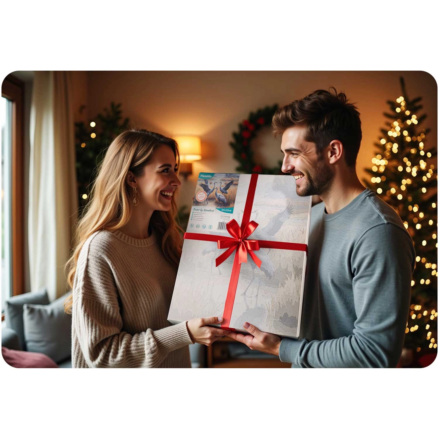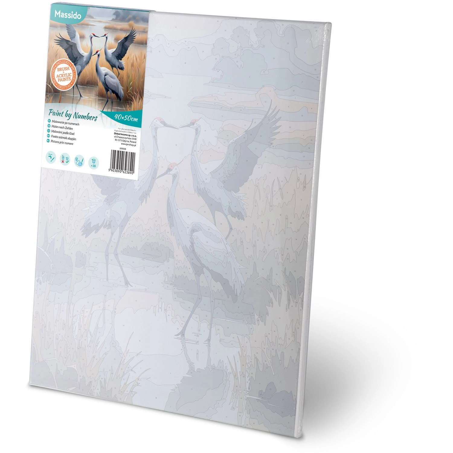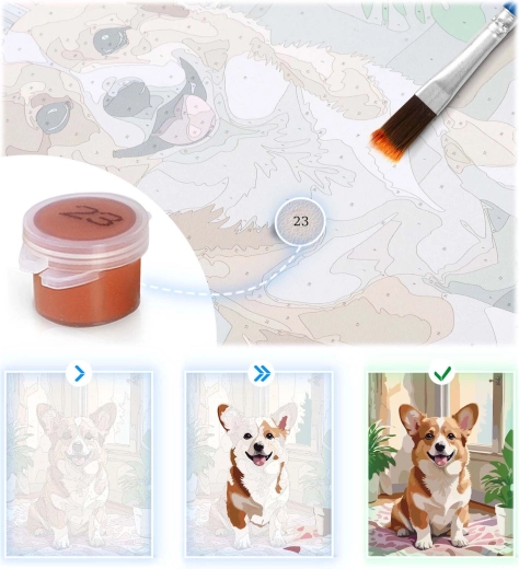 A csomagban mindent megtalál: 40 × 50 cm-es vászon fa vakrámán, 30 számozott festékes tégely, 3 ecset különböző méretben a részletekhez és felületekhez, A4-es papír mintalap, valamint akasztók csavarokkal a kész kép könnyű felhelyezéséhez.