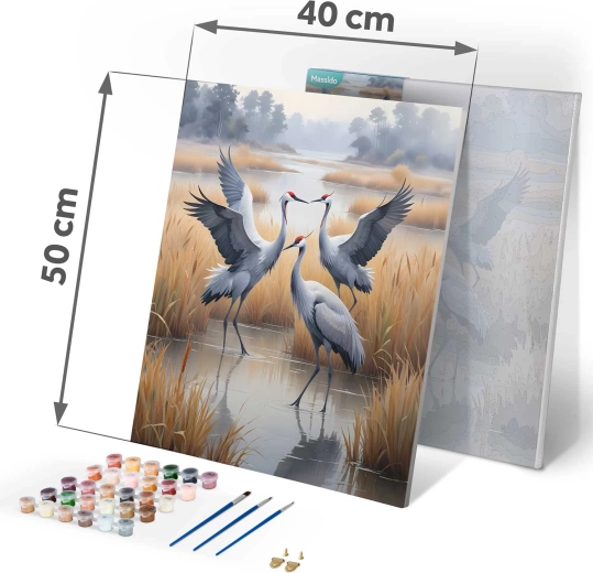 Fedezze fel az alkotás örömét ezzel a minőségi számozott kifestő készlettel 40 × 50 cm méretben. A mocsárban álló elegáns darvak motívuma kiemelkedik a 30 fedő akrilfestéknek, a feszített és alapozott, keretre húzott vászonnak, a három precíz ecsetnek és a csomagban található akasztó kellékeknek köszönhetően. Kezdőknek és haladóknak egyaránt ideális – csak kövesse a számokat, és hatásos, azonnal felakasztható művet alkot.